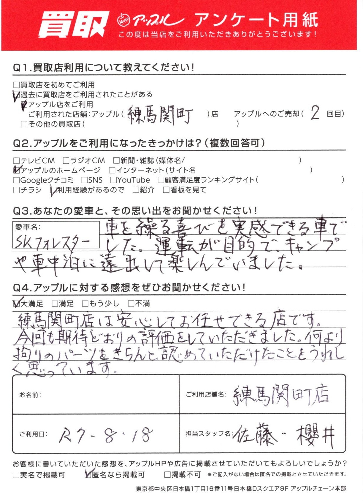 お車:SKフォレスター Q.愛車との思い出は?車を繰る喜びを実感できる車でした。運転が目的で、キャンプや車中泊に遠出して楽しんでいました。Q.アップルの感想は?A.大満足:練馬関町店は安心してお任せできる店です。今回も期待どおりの評価をしていただきました。何より拘りのパーツをきちんと認めていただけたことをうれしく思っています。