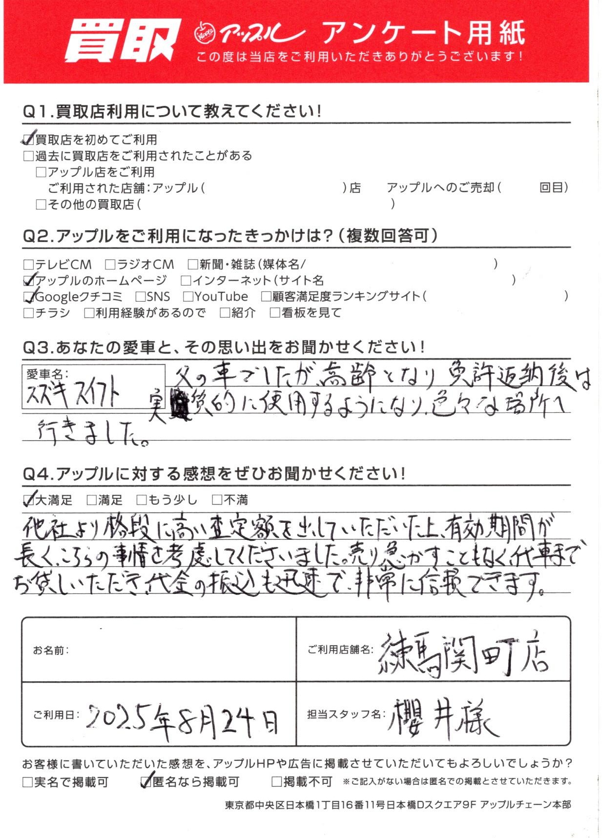お車:スズキ スイフト Q.愛車との思い出は?父の車でしたが、高齢となり免許返納後は実質的に使用するようになり、色々な場所へ行きました。Q.アップルの感想は?A.大満足:他社より格段に高い査定額を出していただ上、有効期間が長く、こちらの事情を考慮してくださいました。売り急かすこともなく、代車までお貸しいただき、代金の振込も迅速で、非常に信頼できます。