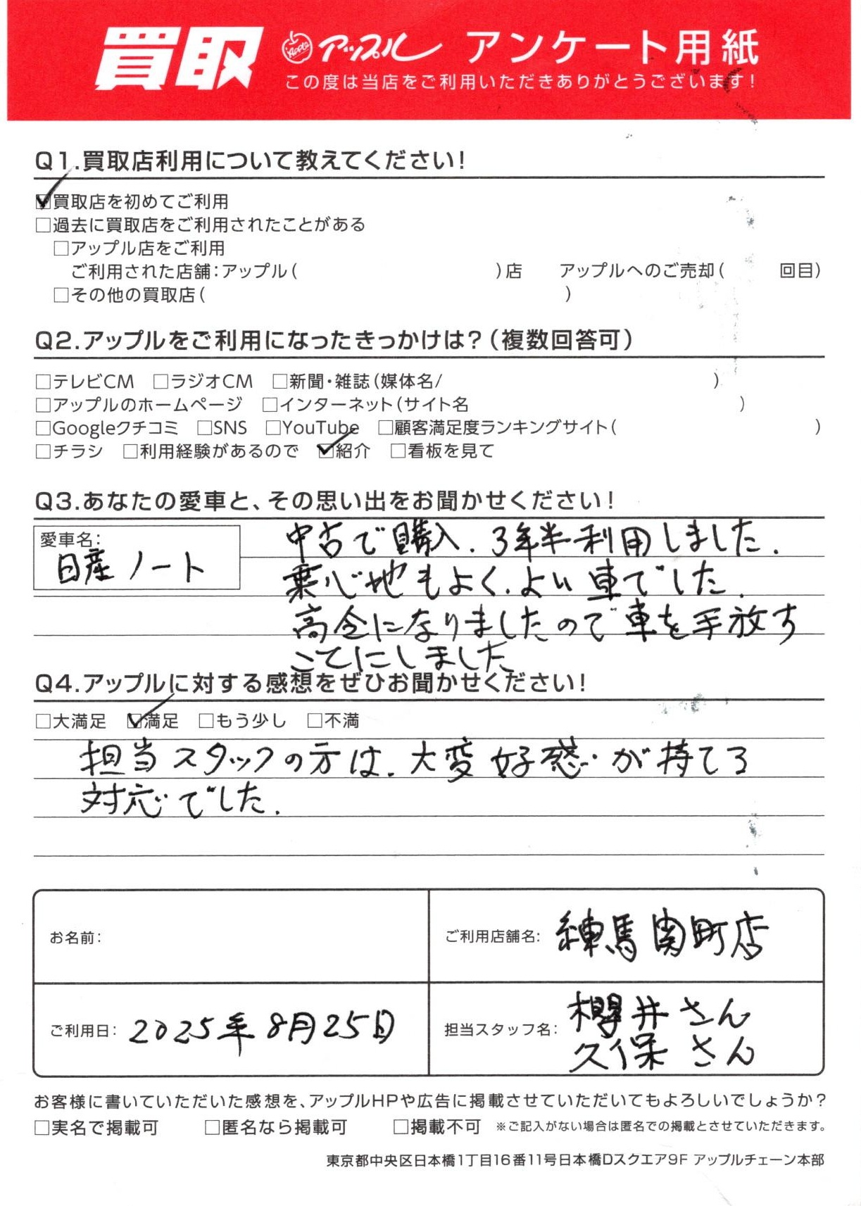 お車のご相談・ 査定だけでもOK! カンタン 入力 30秒 アップルがブランド買取始めました! お電話でも受付中! 受付時間10:00 ~ 19:00 03-5903-8567 お車のご相談・ 査定だけでもOK! カンタン 入力 30秒 アップルがブランド買取始めました! お電話でも受付中! 受付時間10:00 ~ 19:00 03-5903-8567 アップルがブランド買取始めました! お電話でも受付中! 受付時間10:00 ~ 19:00 03-5903-8567 店舗情報 在庫車 スタッフ紹介 ブログ お客様の声 キャンペーン お得 無料査定 click お客様の声 ご記入日: 2025/08/25 S・F様 車名:日産 ノート お車:日産ノート Q.愛車との思い出は?中古で購入、3年半利用しました。乗心地もよく、よい車でした。高齢になりましたので車を手放すことにしました。Q.アップルの感想は?A.満足:担当スタッフの方は、大変好感が持てる対応でした。 前へ 次へ お客様の声一覧を見る