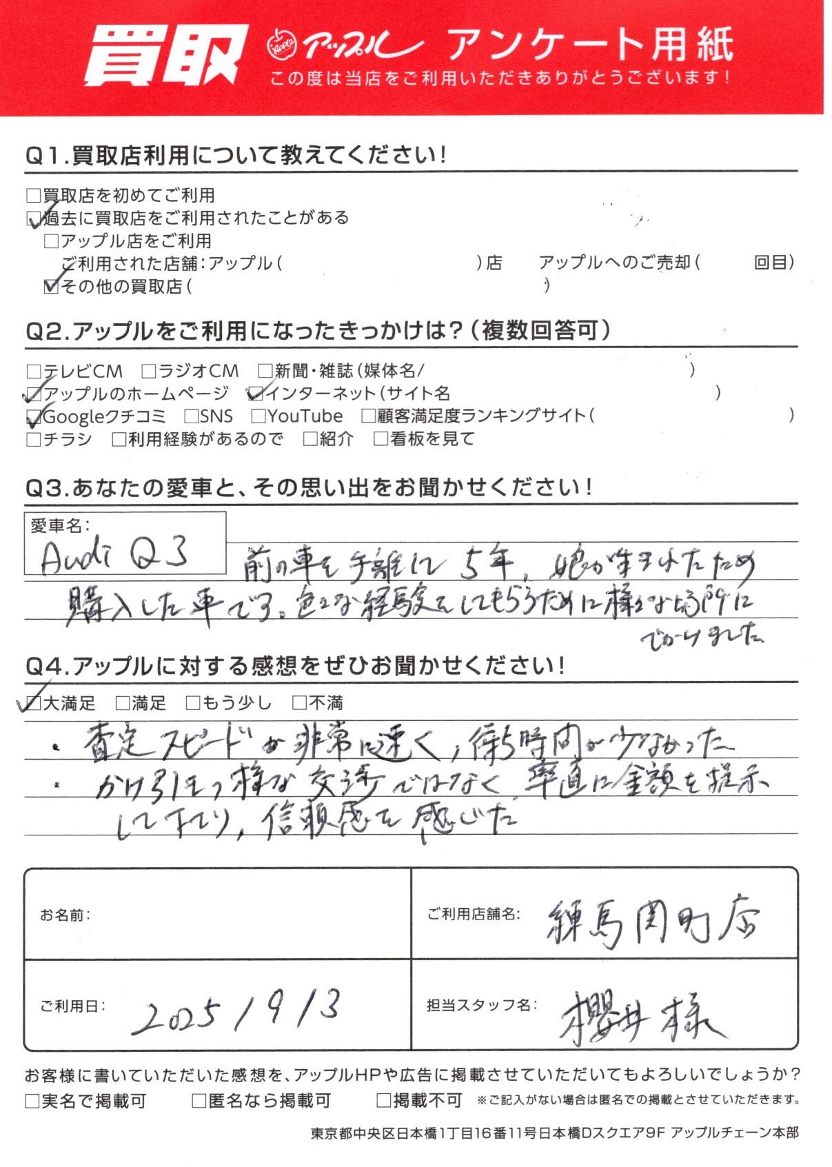 お車:Audi Q3 Q.愛車との思い出は?前の車を手離して5年、娘が生まれたため購入した車です。色々な経験をしてもらうために様々な場所にでかけました。Q.アップルの感想は?A.大満足:査定スピードが非常に速く、待ち時間が少なかった。かけ引きの様な交渉ではなく、率直に金額を提示して下さり、信頼感を感じた。