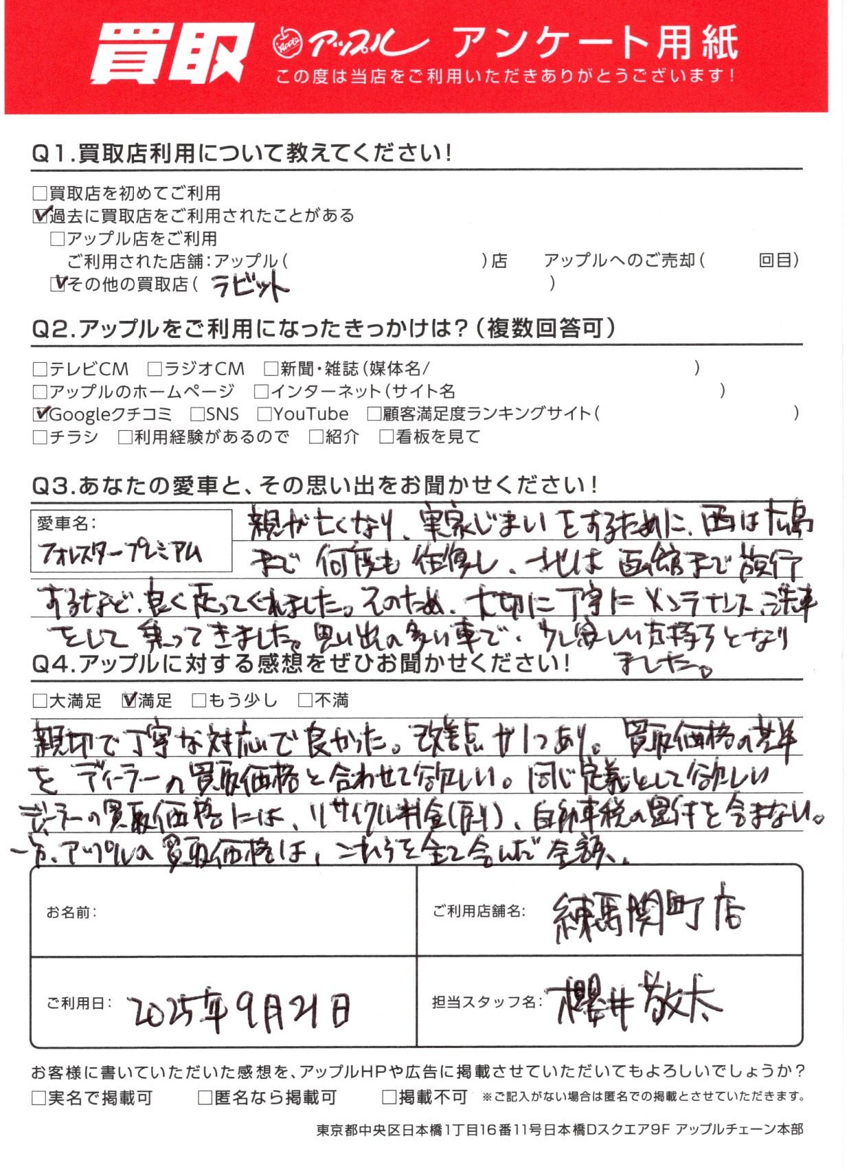 お車:フォレスタープレミアム Q.愛車との思い出は?親が亡くなり、実家じまいをするために、西は広島まで何度も往復し、北は函館まで旅行するなど、良く走ってくれました。そのため、大切に丁寧にメンテナンス、洗車をして乗ってきました。思い出の多い車で、少し寂しい気持ちとなりました。 Q.アップルの感想は?A.満足:親切で丁寧な対応で良かった。改善点が1つあり。買取価格の基準をでぃらーの買取価格と合わせて欲しい。同じ定義として欲しい。ディーラーの買取価格には、リサイクル料金(戻り)、自動車税の還付を含まない。一方、アップルの買取価格は、これらを全て含んだ金額。