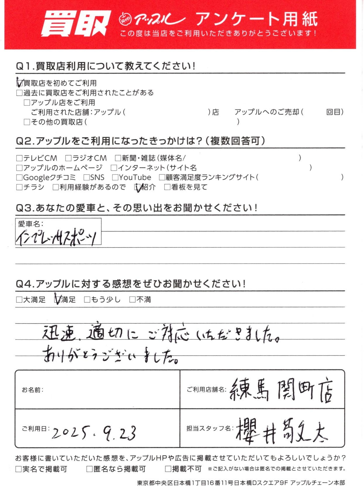 お車のご相談・ 査定だけでもOK! カンタン 入力 30秒 アップルがブランド買取始めました! お電話でも受付中! 受付時間10:00 ~ 19:00 03-5903-8567 お車のご相談・ 査定だけでもOK! カンタン 入力 30秒 アップルがブランド買取始めました! お電話でも受付中! 受付時間10:00 ~ 19:00 03-5903-8567 アップルがブランド買取始めました! お電話でも受付中! 受付時間10:00 ~ 19:00 03-5903-8567 店舗情報 在庫車 スタッフ紹介 ブログ お客様の声 キャンペーン お得 無料査定 click お客様の声 ご記入日: 2025/09/23 T・A様 車名:スバル インプレッサスポーツ お車:インプレッサスポーツ Q.愛車との思い出は? Q.アップルの感想は?A.満足:迅速、適切にご対応いただきました。ありがとうございました。 前へ 次へ お客様の声一覧を見る