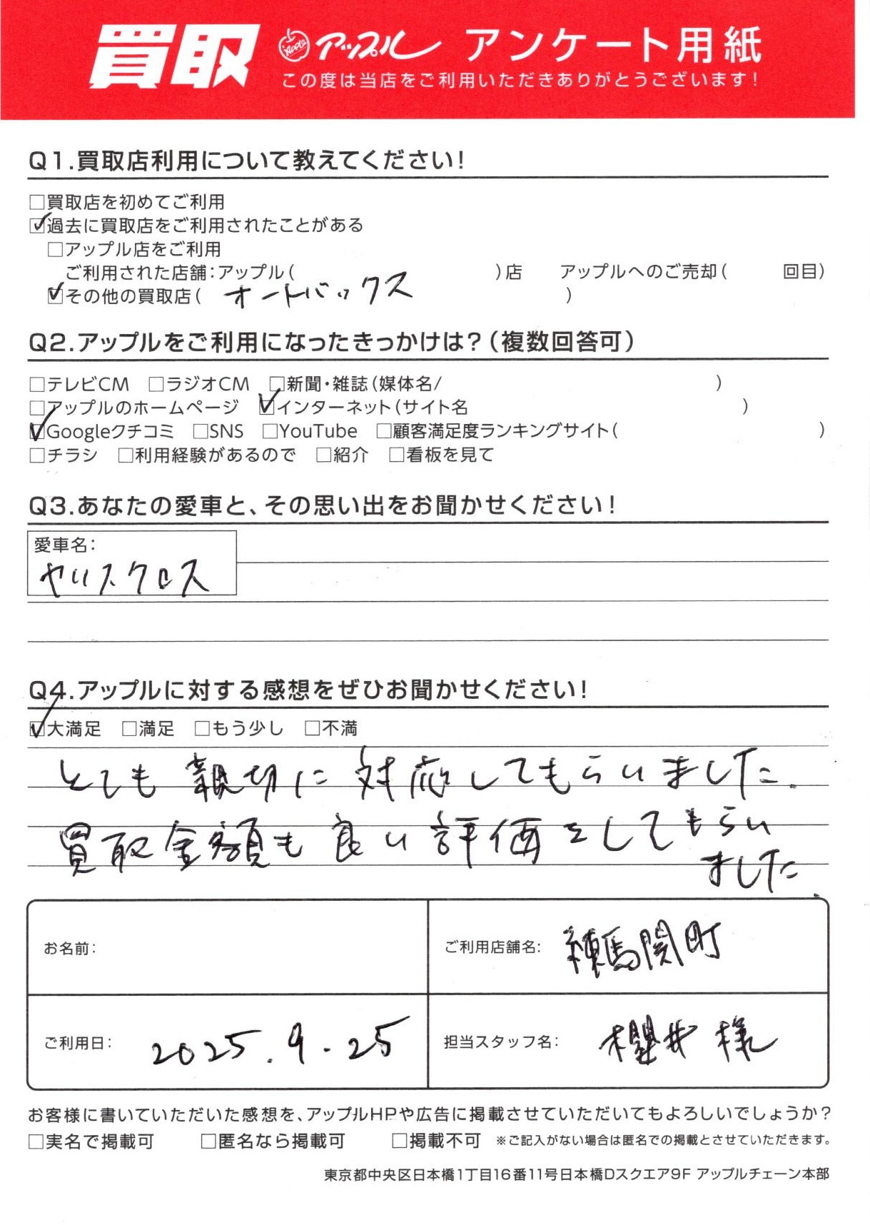 お車のご相談・ 査定だけでもOK! カンタン 入力 30秒 アップルがブランド買取始めました! お電話でも受付中! 受付時間10:00 ~ 19:00 03-5903-8567 お車のご相談・ 査定だけでもOK! カンタン 入力 30秒 アップルがブランド買取始めました! お電話でも受付中! 受付時間10:00 ~ 19:00 03-5903-8567 アップルがブランド買取始めました! お電話でも受付中! 受付時間10:00 ~ 19:00 03-5903-8567 店舗情報 在庫車 スタッフ紹介 ブログ お客様の声 キャンペーン お得 無料査定 click お客様の声 ご記入日: 2025/09/25 杉並区 S・T様 車名:トヨタ ヤリスクロス お車:ヤリスクロス Q.愛車との思い出は? Q.アップルの感想は?A.大満足:とても親切に対応してもらいました。買取金額も良い評価をしてもらいました。 前へ 次へ お客様の声一覧を見る