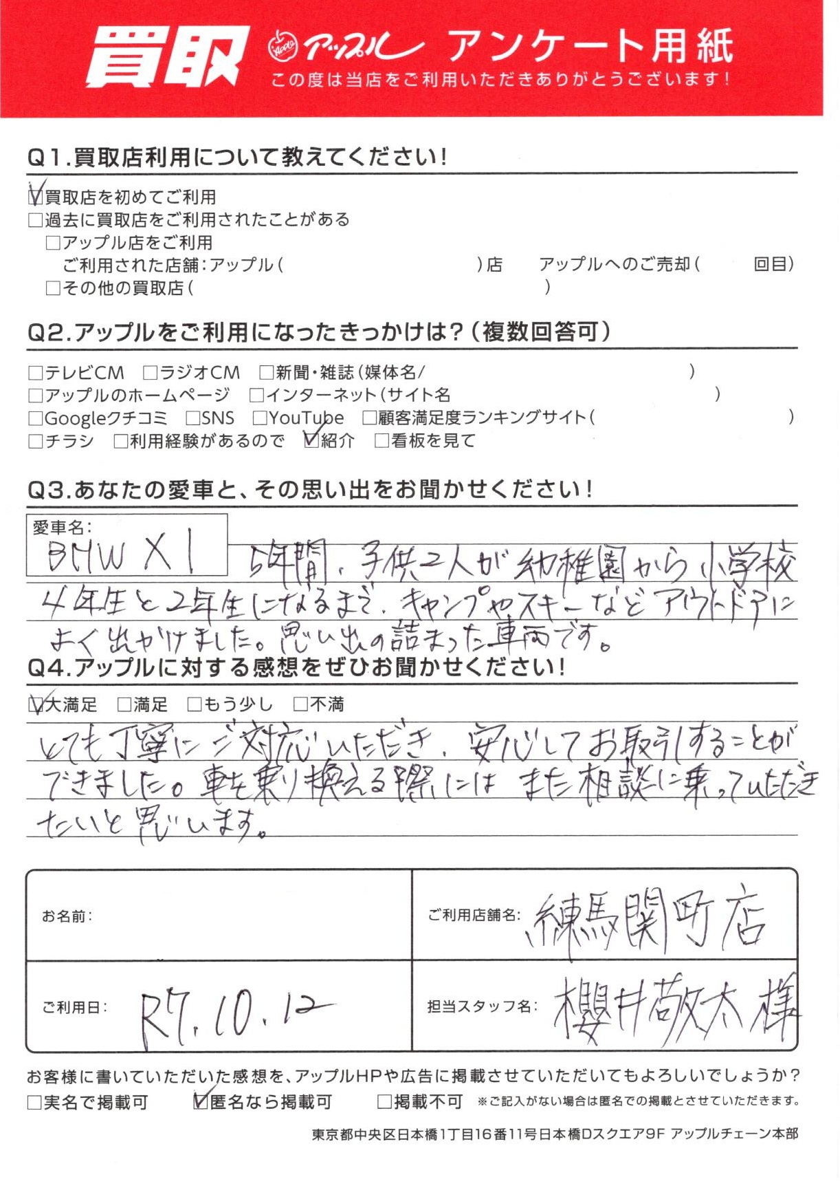 お車:BMW X1 Q.愛車との思い出は?5年間、子供2人が幼稚園から小学校4年生と2年生になるまで、キャンプやスキーなどアウトドアによく出かけました。思い出の詰まった車両です。 Q.アップルの感想は?A.大満足:とても丁寧にご対応いただき、安心してお取引することができました。車を乗り換える際にはまた相談に乗っていただきたいと思います。