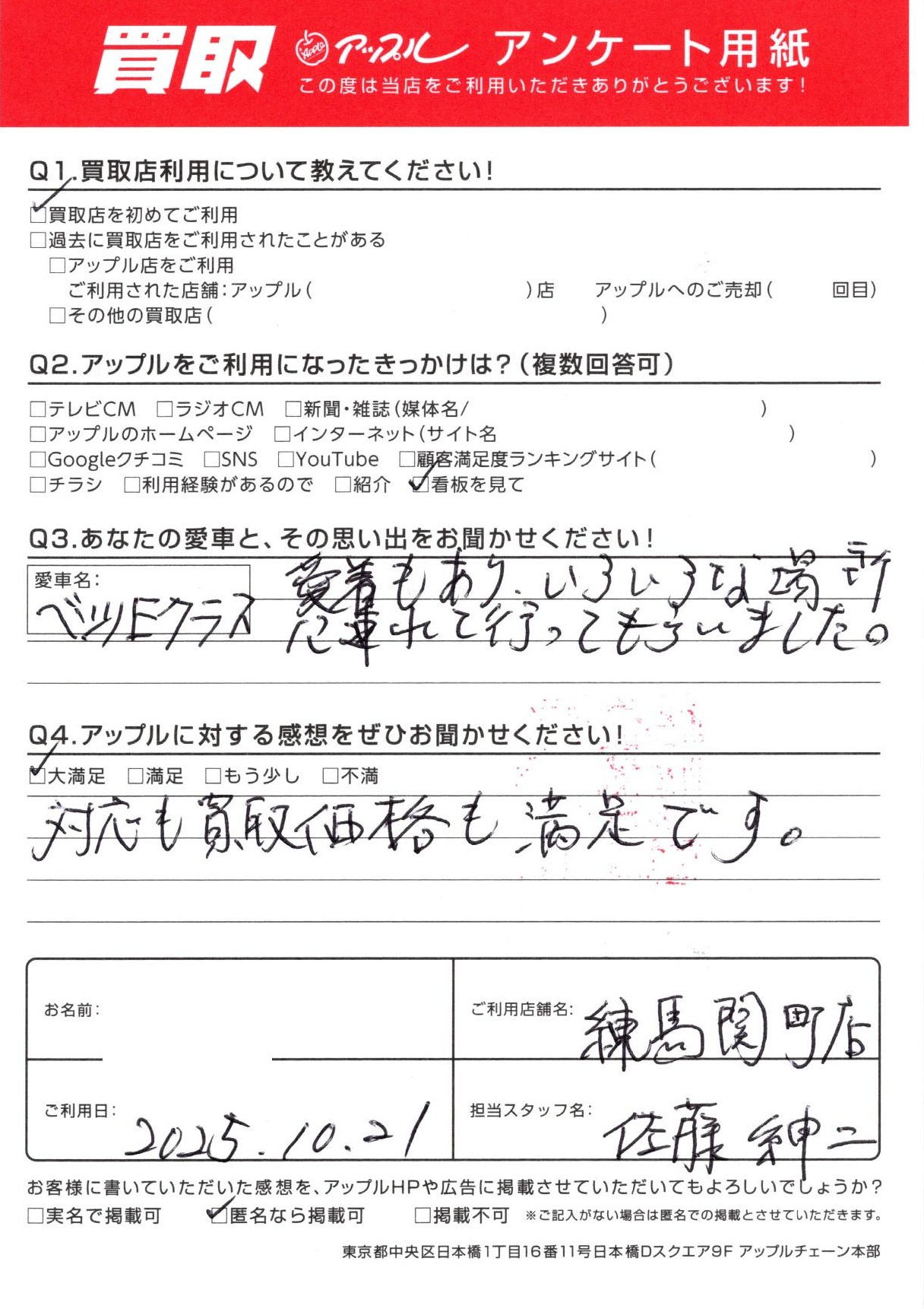 お車のご相談・ 査定だけでもOK! カンタン 入力 30秒 アップルがブランド買取始めました! お電話でも受付中! 受付時間10:00 ~ 19:00 03-5903-8567 お車のご相談・ 査定だけでもOK! カンタン 入力 30秒 アップルがブランド買取始めました! お電話でも受付中! 受付時間10:00 ~ 19:00 03-5903-8567 アップルがブランド買取始めました! お電話でも受付中! 受付時間10:00 ~ 19:00 03-5903-8567 店舗情報 在庫車 スタッフ紹介 ブログ お客様の声 キャンペーン お得 無料査定 click お客様の声 ご記入日: 2025/10/21 西東京市 A・T様 車名:メルセデス・ベンツ Eクラス(93年9月~) お車:ベンツEクラス Q.愛車との思い出は?愛着もあり、いろいろな場所に連れて行ってもらいました。 Q.アップルの感想は?A.大満足:対応も買取価格も満足です。 前へ 次へ お客様の声一覧を見る
