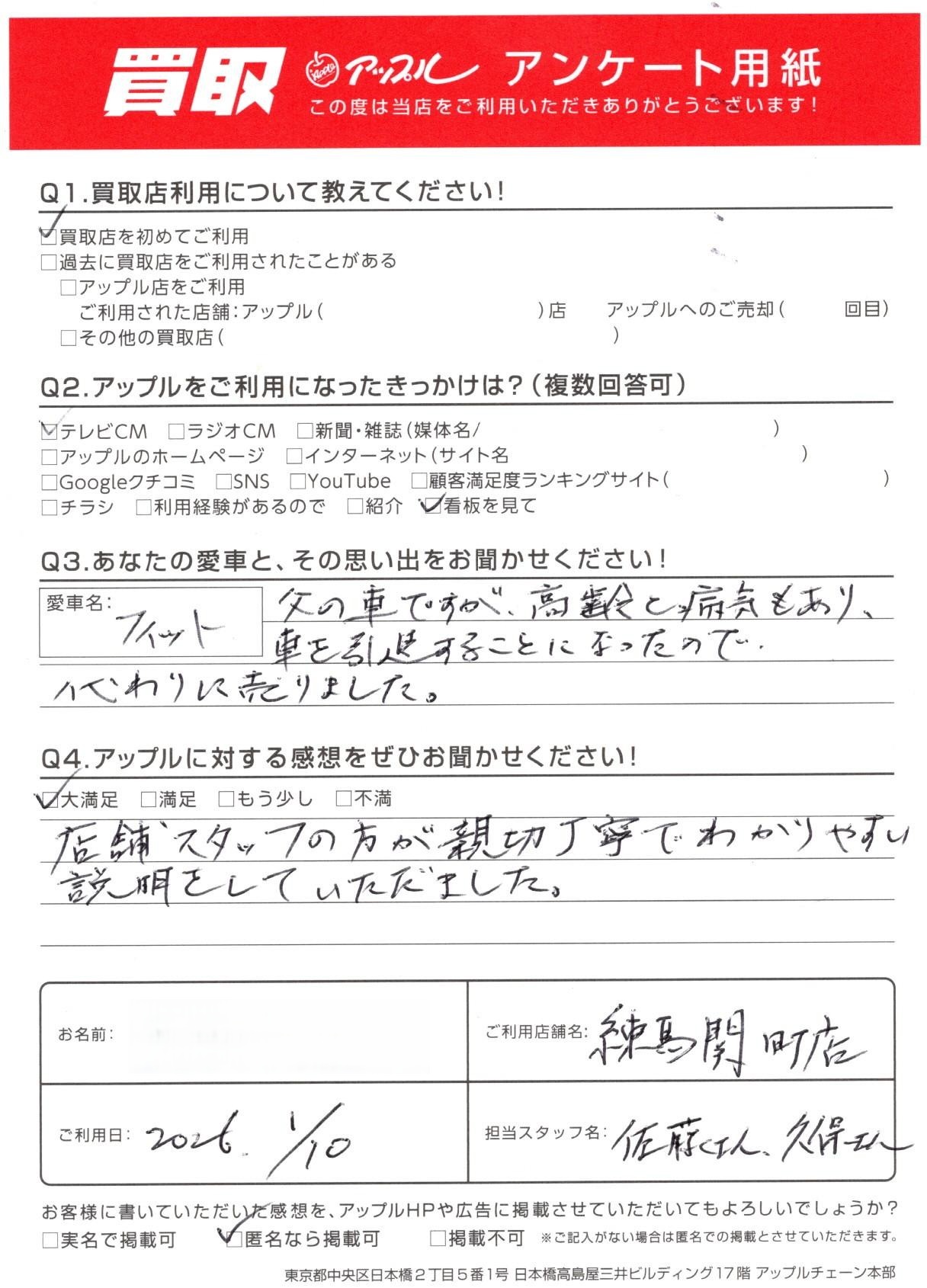 お車のご相談・ 査定だけでもOK! カンタン 入力 30秒 アップルがブランド買取始めました! お電話でも受付中! 受付時間10:00 ~ 19:00 03-5903-8567 お車のご相談・ 査定だけでもOK! カンタン 入力 30秒 アップルがブランド買取始めました! お電話でも受付中! 受付時間10:00 ~ 19:00 03-5903-8567 アップルがブランド買取始めました! お電話でも受付中! 受付時間10:00 ~ 19:00 03-5903-8567 店舗情報 在庫車 スタッフ紹介 ブログ お客様の声 キャンペーン お得 無料査定 click お客様の声 ご記入日: 2026/01/10 新座市 N・K様 車名:ホンダ フィット(H25年9月以降のハイブリッド含む) お車:フィット Q.愛車との思い出は?父の車ですが、高齢と病気もあり、車を引退することになったので代わりに売りました。 Q.アップルの感想は?A.大満足:店舗スタッフの方が親切丁寧でわかりやすい説明をしていただきました。 前へ 次へ お客様の声一覧を見る