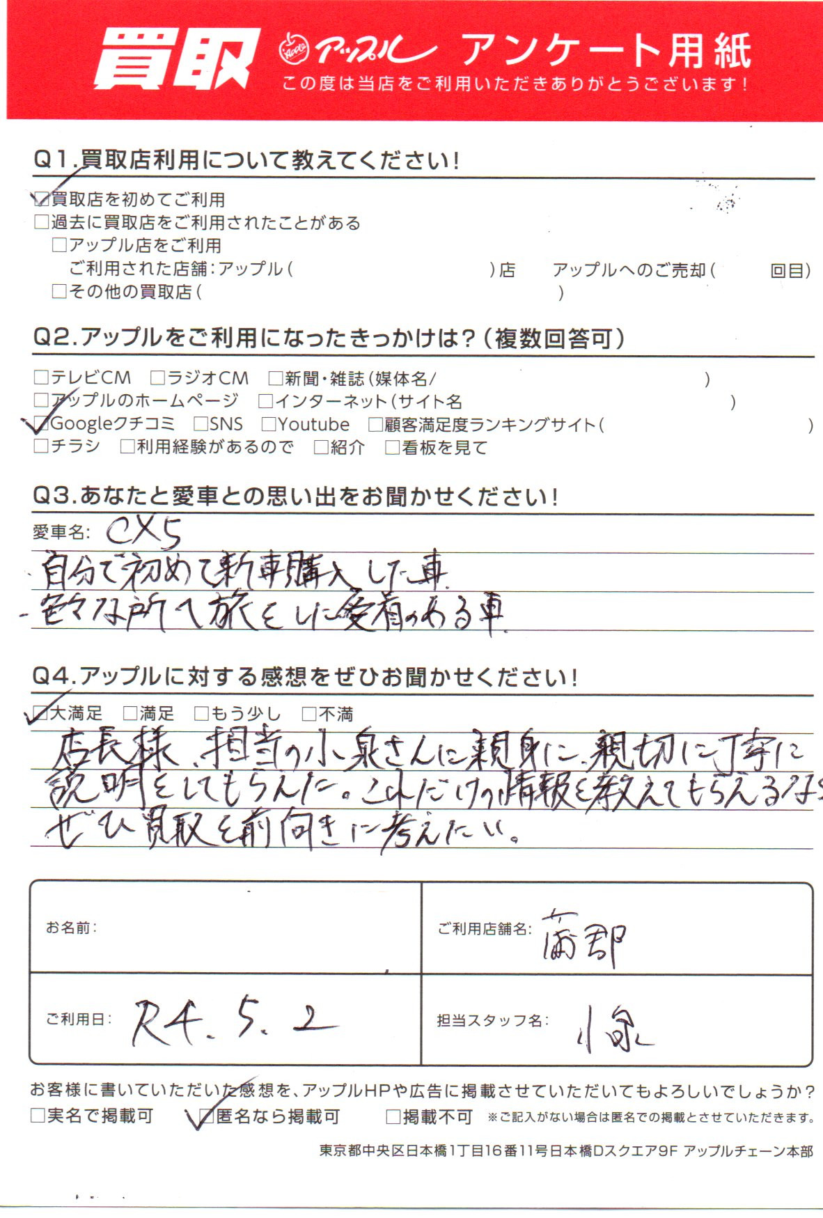 お車のご相談・ 査定だけでもOK! カンタン 入力 30秒 アップルがブランド買取始めました! お電話でも受付中! 受付時間10:00 ~ 19:00(新規ご査定の受付は18:30までとなります。) 0533-66-6666 お車のご相談・ 査定だけでもOK! カンタン 入力 30秒 アップルがブランド買取始めました! お電話でも受付中! 受付時間10:00 ~ 19:00(新規ご査定の受付は18:30までとなります。) 0533-66-6666 アップルがブランド買取始めました! お電話でも受付中! 受付時間10:00 ~ 19:00(新規ご査定の受付は18:30までとなります。) 0533-66-6666 店舗情報 在庫車 スタッフ紹介 ブログ お客様の声 キャンペーン お得 無料査定 click お客様の声 ご記入日: 2022/05/02 愛知県 匿名希望様 車名:マツダ CX-5 店長様、担当の小泉さんに親身に、親切に丁寧に説明してもらえた。これだけの情報を教えてもらえるならぜひ買取を前向きに考えたい。 前へ 次へ お客様の声一覧を見る