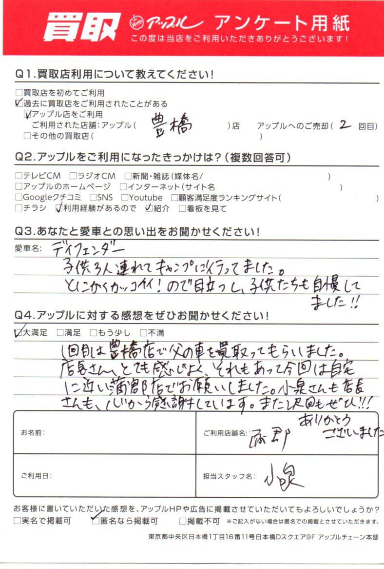 お車のご相談・ 査定だけでもOK! カンタン 入力 30秒 アップルがブランド買取始めました! お電話でも受付中! 受付時間10:00 ~ 19:00(新規ご査定の受付は18:30までとなります。) 0533-66-6666 お車のご相談・ 査定だけでもOK! カンタン 入力 30秒 アップルがブランド買取始めました! お電話でも受付中! 受付時間10:00 ~ 19:00(新規ご査定の受付は18:30までとなります。) 0533-66-6666 アップルがブランド買取始めました! お電話でも受付中! 受付時間10:00 ~ 19:00(新規ご査定の受付は18:30までとなります。) 0533-66-6666 店舗情報 在庫車 スタッフ紹介 ブログ お客様の声 キャンペーン お得 無料査定 click お客様の声 ご記入日: 2022/06/05 愛知県 匿名希望様 車名:ランドローバー ディフェンダー 1回目は豊橋店で父の車を買取ってもらいました。店長さん、とても感じがよく、それもあって今回は自宅に近い蒲郡店でお願いしました。小泉さんも店長さんも、心から感謝しています。また次回もぜひ!!ありがとうございました。 前へ 次へ お客様の声一覧を見る