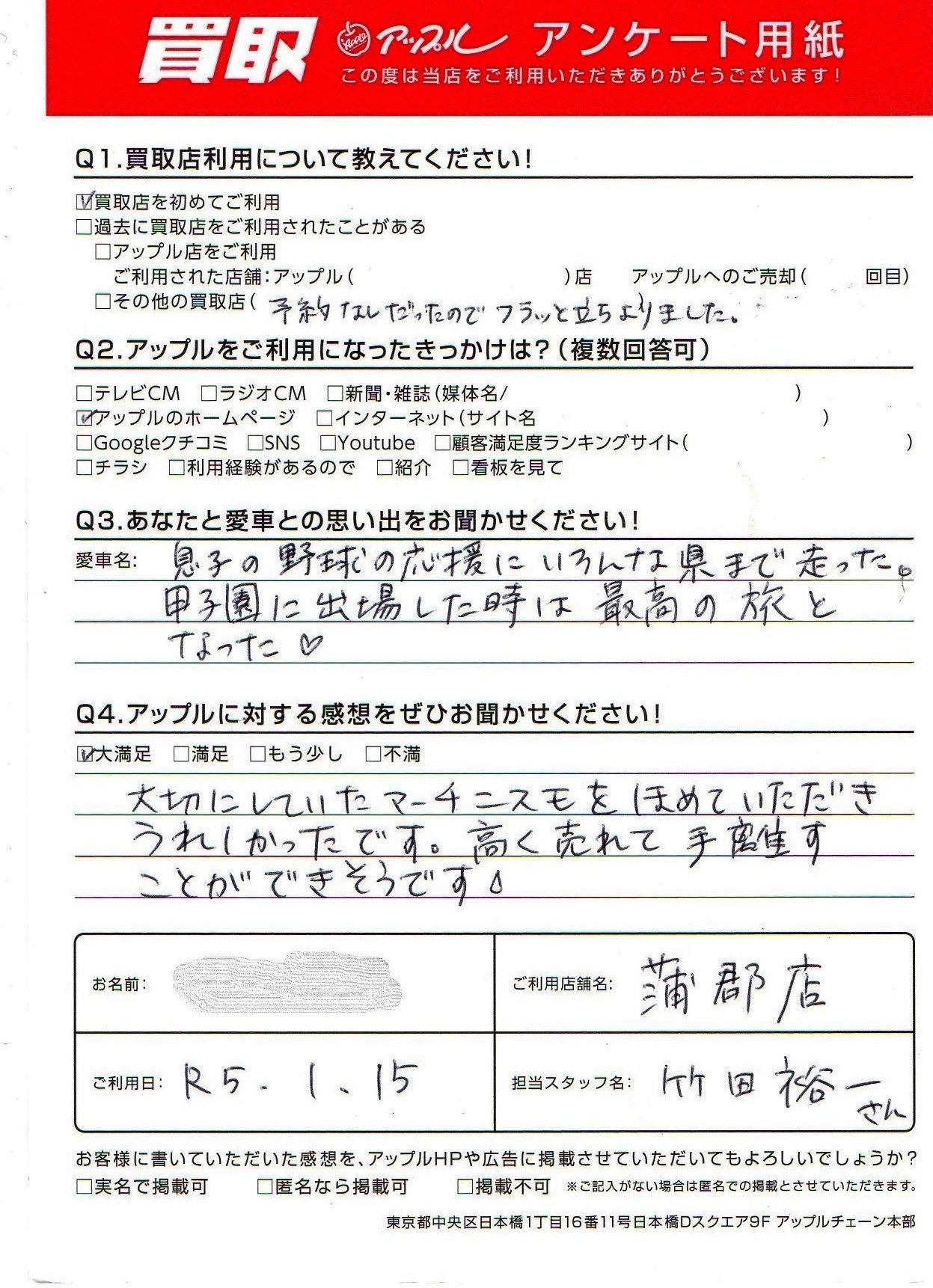 お車のご相談・ 査定だけでもOK! カンタン 入力 30秒 アップルがブランド買取始めました! お電話でも受付中! 受付時間10:00 ~ 19:00(新規ご査定の受付は18:30までとなります。) 0533-66-6666 お車のご相談・ 査定だけでもOK! カンタン 入力 30秒 アップルがブランド買取始めました! お電話でも受付中! 受付時間10:00 ~ 19:00(新規ご査定の受付は18:30までとなります。) 0533-66-6666 アップルがブランド買取始めました! お電話でも受付中! 受付時間10:00 ~ 19:00(新規ご査定の受付は18:30までとなります。) 0533-66-6666 店舗情報 在庫車 スタッフ紹介 ブログ お客様の声 キャンペーン お得 無料査定 click お客様の声 ご記入日: 2023/01/15 愛知県 匿名希望様 車名:日産 マーチ 大切にしていたマーチニスモをほめていただきうれしかったです。高く売れて手離すことができそうです。 前へ 次へ お客様の声一覧を見る