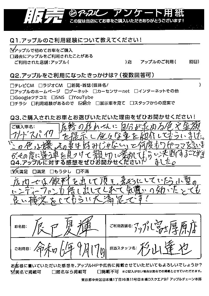 A:店舗の杉山さんに自分が求める色や金額を提示し、色々な車を紹介してもらいました。
