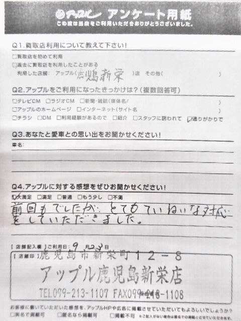 お車のご相談・ 査定だけでもOK! カンタン 入力 30秒 アップルがブランド買取始めました! お電話でも受付中! 受付時間10:00 ~ 19:00 099-213-1107 お車のご相談・ 査定だけでもOK! カンタン 入力 30秒 アップルがブランド買取始めました! お電話でも受付中! 受付時間10:00 ~ 19:00 099-213-1107 アップルがブランド買取始めました! お電話でも受付中! 受付時間10:00 ~ 19:00 099-213-1107 店舗情報 在庫車 スタッフ紹介 ブログ お客様の声 キャンペーン お得 無料査定 click お客様の声 ご記入日: 2019/09/23 鹿児島県南九州市 I様 前回もでしたが、 前へ 次へ お客様の声一覧を見る