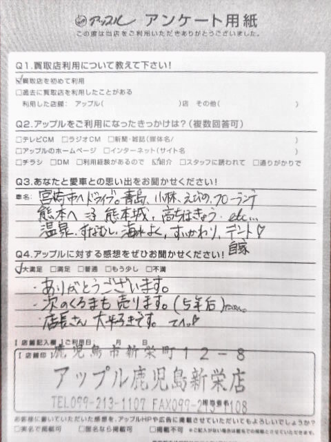 お車のご相談・ 査定だけでもOK! カンタン 入力 30秒 アップルがブランド買取始めました! お電話でも受付中! 受付時間10:00 ~ 19:00 099-213-1107 お車のご相談・ 査定だけでもOK! カンタン 入力 30秒 アップルがブランド買取始めました! お電話でも受付中! 受付時間10:00 ~ 19:00 099-213-1107 アップルがブランド買取始めました! お電話でも受付中! 受付時間10:00 ~ 19:00 099-213-1107 店舗情報 在庫車 スタッフ紹介 ブログ お客様の声 キャンペーン お得 無料査定 click お客様の声 ご記入日: -/-/- 鹿児島県鹿児島市 Y様 車名:スズキ ワゴンR ありがとうございます… 前へ 次へ お客様の声一覧を見る