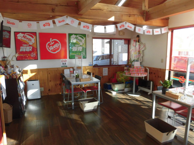 内観はウッド調のログハウス風です。落ち着いた店構えです♪大きなアップルの看板が目印となります。