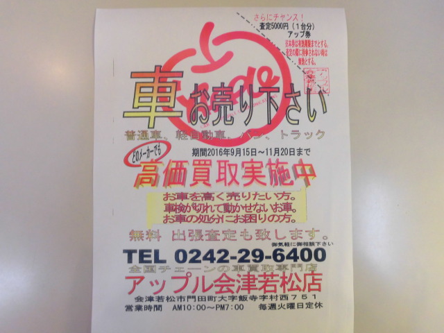 お車のご相談・ 査定だけでもOK! カンタン 入力 30秒 アップルがブランド買取始めました! お電話でも受付中! 受付時間10:00 ~ 18:00 0242-29-6400 お車のご相談・ 査定だけでもOK! カンタン 入力 30秒 アップルがブランド買取始めました! お電話でも受付中! 受付時間10:00 ~ 18:00 0242-29-6400 アップルがブランド買取始めました! お電話でも受付中! 受付時間10:00 ~ 18:00 0242-29-6400 店舗情報 在庫車 スタッフ紹介 ブログ お客様の声 キャンペーン お得 無料査定 click 最新記事一覧 月別アーカイブ 2026年04月(1)2026年03月(1)2026年02月(1)2026年01月(1)2025年12月(1)2025年11月(1)2025年10月(1)2025年08月(2)2025年07月(1)2025年06月(1)2025年05月(1)2025年04月(1)2025年03月(1)2025年02月(1)2025年01月(1)2024年12月(1)2024年11月(1)2024年10月(1)2024年09月(1)2024年08月(1)2024年07月(2)2024年06月(1)2024年04月(2)2024年03月(1)2024年02月(1)2024年01月(1)2023年12月(1)2023年11月(1)2023年10月(1)2023年09月(1)2023年08月(1)2023年07月(1)2023年06月(1)2023年05月(2)2023年04月(1)2023年03月(1)2023年02月(1)2023年01月(1)2022年12月(1)2022年11月(1)2022年10月(1)2022年09月(1)2022年08月(1)2022年07月(2)2022年06月(1)2022年04月(2)2022年03月(1)2022年02月(1)2022年01月(1)2021年12月(1)2021年11月(1)2021年10月(1)2021年09月(1)2021年08月(1)2021年07月(1)2021年06月(1)2021年05月(1)2021年04月(2)2021年03月(1)2021年02月(1)2021年01月(1)2020年12月(1)2020年11月(1)2020年10月(1)2020年09月(2)2020年08月(1)2020年07月(1)2020年06月(1)2020年05月(1)2020年04月(2)2020年03月(1)2020年02月(1)2020年01月(1)2019年12月(1)2019年11月(1)2019年10月(1)2019年09月(1)2019年08月(2)2019年07月(1)2019年06月(1)2019年05月(1)2019年04月(1)2019年03月(1)2019年02月(1)2016年09月(1) 91-95/95件中 [ 未分類 ] 2019/05/18(土) 10:57 5月 長い連休も終わり、ニュースでもとりあげていましたが今回の連休は長すぎたと話す方や、毎年10連休にするといいのでは?との声も聞かれました。いろいろな意見があるかと思います。普段出来ない事が出来たりというのもあるのではないでしょうか?来年は、半分の5連休だそうです。また、新しい元号になり、平成か… [ 未分類 ] 2019/04/18(木) 14:03 4月おすすめ車!! アップル会津若松店の古河です。今年は、4月に入っても雪が降ったりといつまでも冬の気候が残り寒いです。また、花粉が多い年のようで、大変な時期でもありますね。タイヤ交換もいつ交換するか考えるところですが、これから、交換という方、お問い合わせ下さい。タイヤ交換オイル交換承っております。軽自動車も普… [ 未分類 ] 2019/03/08(金) 14:40 3月もキャンペーン中です アップル会津若松店の古河です。3月に入り朝晩、寒いものの、日中の気温も少しづつ上がり暖かくなってきました。車両の入れ替えも多くなりました。車の売却では、税金関係で今月中遅くても25日までに手続き済ませてないと、4月には、税金が発生してしまうことになります。売却を検討しているという場合は早めの… [ 入庫情報 ] 2019/02/04(月) 16:03 キャンペーン実施中!&バレンタイン 早いもので、2月に入りました1ヶ月過ぎるのが早いですね。1月からひきつづきありがとうキャンペーン実施中です。豪華賞品が抽選で当たりますお車の売却を検討中の方はもちろん新車や中古車の販売もしておりますのでこの機会にぜひ、アップル会津若松店へお越し下さい!豪華賞品をゲットできるチャンスですよ!(… [ 未分類 ] 2016/09/10(土) 12:11 高価買取実施中! こんにちは!アップル会津若松店の古河です。9月になり、朝、晩少しずつ涼しくなってきましたが、日中はまだまだ暑~い!セミの鳴き声も衰えたというのに、いつまでこの暑さは続くのでしょうか?午後は暑くて仕事になりません。しかし!りんご、栗、さつまいも、ぶどう、秋刀魚etc・・。秋の味覚が出回り始めこ… 6 7 8 9 10 最新記事 桜キャンペーン最終月になりました!立春 春が近づいています!NO.1獲得キャンペーン12月今年最後の月 会津若松店の お客様の声 会津若松店をご利用されたお客様からいただいた 貴重なご意見をご紹介させていただきます。 お客様の声一覧を見る 会津若松店 H様 ご記入日: 2025/02/15 ご利用日:2025年2月15日担当:平野Q:アップルに対するご感想をぜひお聞かせください!!A:大… 会津若松店 日産 デイズ A様 ご記入日: 2024/12/15 ご利用日:2024年12月15日担当:古河Q:あなたの愛車との思い出をお聞かせください!A:発売間… 会津若松店 日産 エクストレイル S様 ご記入日: 2024/12/14 ご利用日:2024年12月14日担当:古河Q:あなたの愛車との思い出をお聞かせください!A:父が乗… 会津若松店 ホンダ フリード(H28年9月以降のハイブリッド含む) S様 ご記入日: 2024/11/23 愛車:ホンダフリード担当:古河Q:あなたの愛車と、その思い出をお聞かせください!A:子供が生まれて… 会津若松店 ホンダ ライフ S様 ご記入日: 2025/11/27 愛車:ホンダライフ担当:平野Q:あなたの愛車と、その思い出をお聞かせください!A:主人が長い間病期… 会津若松店 B様 ご記入日: 2024/10/25 ご利用日:2024年10月25日担当:古河Q:アップルに対する感想をぜひお聞かせください!!A:大… お客様の声一覧を見る 会津若松店の キャンペーン 会