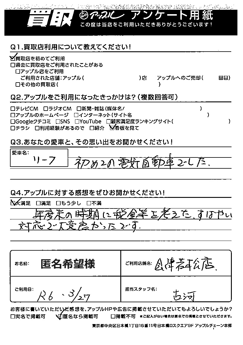 匿名希望様 車名:日産 リーフ
