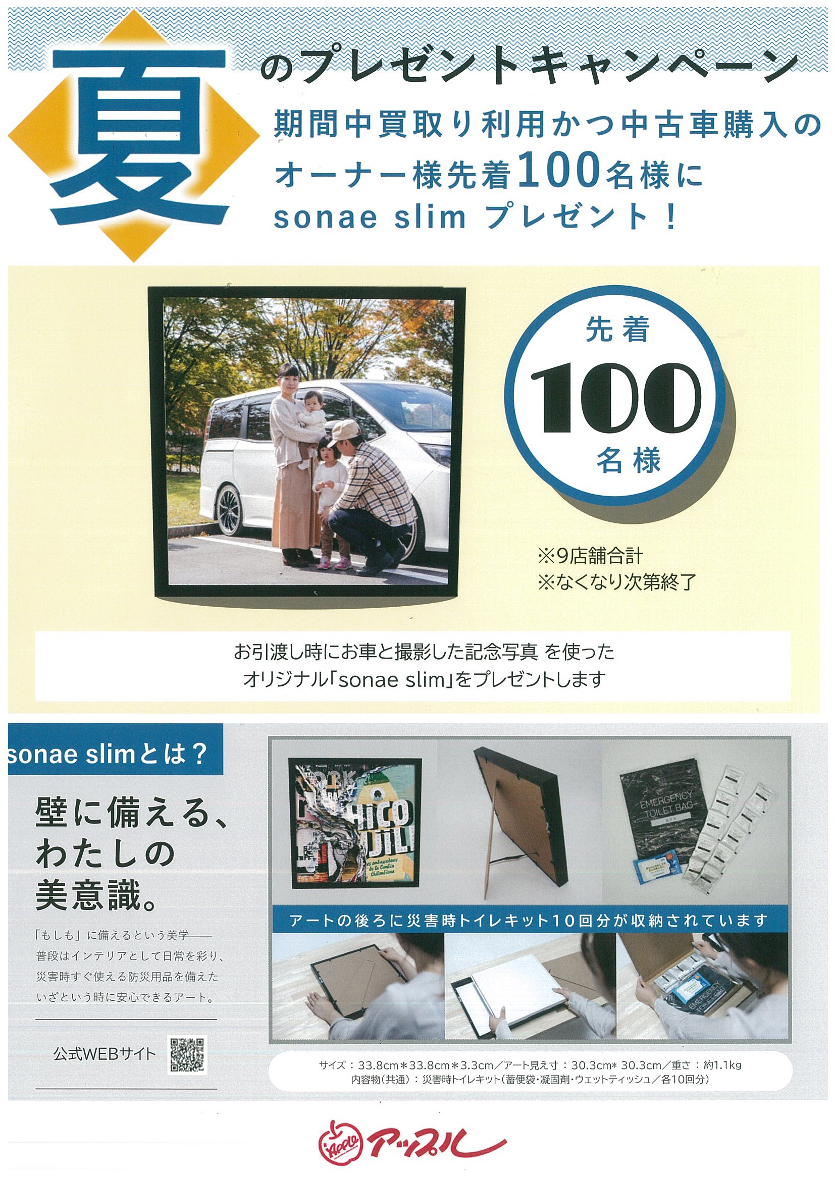 期間中買取り利用かつ中古車購入のオーナー様先着100枚様にsonae slimプレゼント!