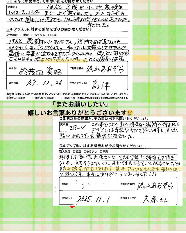 お車のご相談・ 査定だけでもOK! カンタン 入力 30秒 アップルがブランド買取始めました! お電話でも受付中! 受付時間10:00 ~ 18:30 0120-703-903 お車のご相談・ 査定だけでもOK! カンタン 入力 30秒 アップルがブランド買取始めました! お電話でも受付中! 受付時間10:00 ~ 18:30 0120-703-903 アップルがブランド買取始めました! お電話でも受付中! 受付時間10:00 ~ 18:30 0120-703-903 店舗情報 在庫車 スタッフ紹介 ブログ お客様の声 キャンペーン お得 無料査定 click [ 未分類 ] 2026/02/09 (月) 16:12 温かいお客様の声いただきました(^▽^)/ こんにちは😊アップル流山あおぞら店です。週末は雪が降り冷え込みましたね🥶冷え込んでいましたがまだ投票に行っていなかったので完全防備でいってきました!そんな中、心あたためる「お客様の声」いただきました🙌🙌🙌たくさん走った大切なお車。たくさん走った距離と時間には大切な思い出が詰まっていることと思います。当店にお任せいただき誠にありがとうございました!また是非!お願いいたします(o^―^o)他にもお客様の声多数いただいております!ぜひチェックしてみてくださいね*****************************************************************************アップル流山あおぞら店、沢山のクチコミをいただいております!↓こちらから口コミご覧ください↓「お客様の声」はこちらから是非ご覧ください★ 2026-02-09 16:12:00 新しい記事へ 古い記事へ 最新記事 春の気配3月限定!令和8年度自動車税アップル全額負担!!ハイブリッドカー強化買取中3月までに名義変更可能!クルマ売るなら「今」がチャンス! 店舗情報に戻る 月別アーカイブ 2026年03月(4)2026年02月(12)2026年01月(16)2025年12月(13)2025年11月(13)2025年10月(29)2025年09月(15)2025年08月(23)2025年07月(22)2025年06月(11)2025年05月(4)2025年04月(5)2025年03月(4)2025年02月(6)2025年01月(5)2024年12月(6)2024年11月(5)2024年10月(7)2024年09月(1)2024年08月(4)2024年07月(1)2024年06月(1)2024年04月(2)2023年12月(1)2023年11月(1)2023年08月(1)2023年07月(2)2023年06月(2)2023年05月(1)2023年04月(1)2023年03月(1)2023年02月(2)2023年01月(1)2022年12月(1)2022年10月(1)2022年09月(3)2022年08月(2)2022年07月(1)2022年04月(2)2022年03月(3)2022年01月(3)2021年12月(11)2021年11月(2)2021年10月(1)2021年09月(3)2021年08月(5)2021年07月(6)2021年06月(8)2021年05月(5)2021年04月(2)2021年03月(2)2021年02月(2)2021年01月(4)2020年12月(3)2020年11月(4)2020年10月(4)2020年09月(7)2020年08月(6)2020年07月(12)2020年06月(9)2020年05月(7)2020年04月(8)2020年03月(10)2020年02月(8)2020年01月(9)2019年12月(10)2019年11月(8)2019年10月(22)2019年09月(8)2019年06月(3)2019年05月(8)2019年04月(2)2019年03月(1)2019年02月(3)2019年01月(2)2018年12月(5)2018年11月(6)2018年10月(1)2018年09月(6)2018年08月(7)2018年07月(8)2018年06月(3)2018年05月(3)2018年04月(4)2018年03月(6)2018年02月(5)2018年01月(8)2017年12月(7)2017年11月(7)2017年10月(8)2017年09月(8)2017年08月(7)2017年07月(11)2017年06月(9)2017年05月(5)2017年04月(12)2017年03月(9)2017年02月(11)2017年01月(12)2016年12月(16)2016年11月(23)2016年10月(31)2016年09月(30)2016年08月(15)2016年07月(5)2016年06月(17)2016年05月(6)2016年04月(4)2016年03月(3)2016年02月(6)2016年01月(8)2015年12月(6)2015年11月(5)2015年10月(6)2015年09月(6)2015年08月(8)2015年07月(11)2015年06月(8)2015年05月(6)2015年04月(7)2015年03月(7)2015年02月(9)2015年01月(11)2014年12月(14)2014年11月(18)2014年10月(17)2014年09月(17)2014年08月(12)2014年07月(15)2014年06月(6)