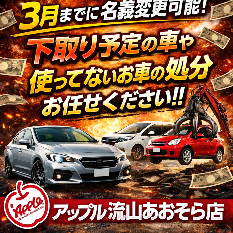お車のご相談・ 査定だけでもOK! カンタン 入力 30秒 アップルがブランド買取始めました! お電話でも受付中! 受付時間10:00 ~ 18:30 0120-703-903 お車のご相談・ 査定だけでもOK! カンタン 入力 30秒 アップルがブランド買取始めました! お電話でも受付中! 受付時間10:00 ~ 18:30 0120-703-903 アップルがブランド買取始めました! お電話でも受付中! 受付時間10:00 ~ 18:30 0120-703-903 店舗情報 在庫車 スタッフ紹介 ブログ お客様の声 キャンペーン お得 無料査定 click [ つぶやき ] 2026/03/02 (月) 18:51 3月までに名義変更可能! 🚗💨【3月までに名義変更可能!】下取り予定のお車や、ずっと使っていないお車の処分でお困りの方‼️✨アップル流山あおぞら店にお任せください✨✔ 名義変更までしっかり対応✔ 動かない車もご相談OK✔ 下取り・処分まとめて対応します「いつかやろう…」は今がチャンス🔥まずはお気軽にご相談ください😊📍アップル流山あおぞら店ご来店・お問い合わせお待ちしております🍎 2026-03-02 18:51:00 新しい記事へ 古い記事へ 最新記事 春の気配3月限定!令和8年度自動車税アップル全額負担!!ハイブリッドカー強化買取中3月までに名義変更可能!クルマ売るなら「今」がチャンス! 店舗情報に戻る 月別アーカイブ 2026年03月(4)2026年02月(12)2026年01月(16)2025年12月(13)2025年11月(13)2025年10月(29)2025年09月(15)2025年08月(23)2025年07月(22)2025年06月(11)2025年05月(4)2025年04月(5)2025年03月(4)2025年02月(6)2025年01月(5)2024年12月(6)2024年11月(5)2024年10月(7)2024年09月(1)2024年08月(4)2024年07月(1)2024年06月(1)2024年04月(2)2023年12月(1)2023年11月(1)2023年08月(1)2023年07月(2)2023年06月(2)2023年05月(1)2023年04月(1)2023年03月(1)2023年02月(2)2023年01月(1)2022年12月(1)2022年10月(1)2022年09月(3)2022年08月(2)2022年07月(1)2022年04月(2)2022年03月(3)2022年01月(3)2021年12月(11)2021年11月(2)2021年10月(1)2021年09月(3)2021年08月(5)2021年07月(6)2021年06月(8)2021年05月(5)2021年04月(2)2021年03月(2)2021年02月(2)2021年01月(4)2020年12月(3)2020年11月(4)2020年10月(4)2020年09月(7)2020年08月(6)2020年07月(12)2020年06月(9)2020年05月(7)2020年04月(8)2020年03月(10)2020年02月(8)2020年01月(9)2019年12月(10)2019年11月(8)2019年10月(22)2019年09月(8)2019年06月(3)2019年05月(8)2019年04月(2)2019年03月(1)2019年02月(3)2019年01月(2)2018年12月(5)2018年11月(6)2018年10月(1)2018年09月(6)2018年08月(7)2018年07月(8)2018年06月(3)2018年05月(3)2018年04月(4)2018年03月(6)2018年02月(5)2018年01月(8)2017年12月(7)2017年11月(7)2017年10月(8)2017年09月(8)2017年08月(7)2017年07月(11)2017年06月(9)2017年05月(5)2017年04月(12)2017年03月(9)2017年02月(11)2017年01月(12)2016年12月(16)2016年11月(23)2016年10月(31)2016年09月(30)2016年08月(15)2016年07月(5)2016年06月(17)2016年05月(6)2016年04月(4)2016年03月(3)2016年02月(6)2016年01月(8)2015年12月(6)2015年11月(5)2015年10月(6)2015年09月(6)2015年08月(8)2015年07月(11)2015年06月(8)2015年05月(6)2015年04月(7)2015年03月(7)2015年02月(9)2015年01月(11)2014年12月(14)2014年11月(18)2014年10月(17)2014年09月(17)2014年08月(12)2014年07月(15)2014年06月(6)