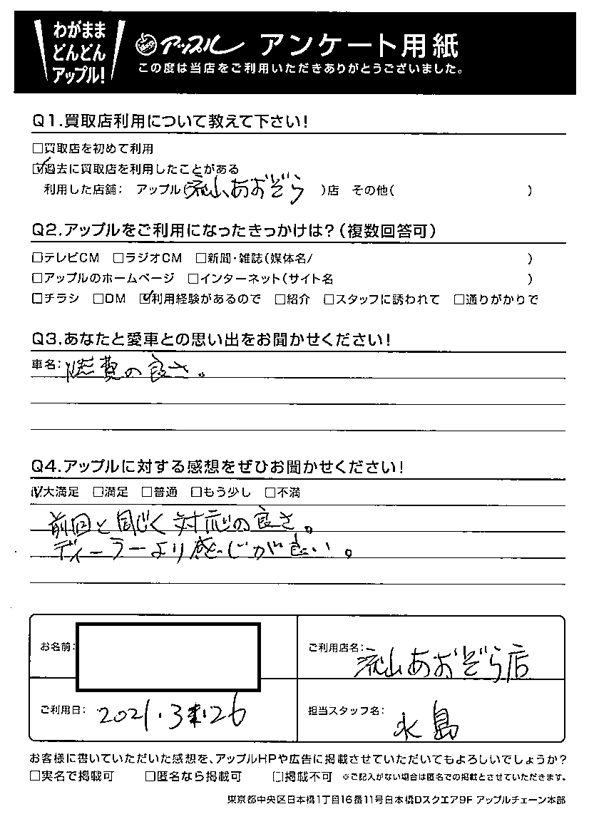 お車のご相談・ 査定だけでもOK! カンタン 入力 30秒 アップルがブランド買取始めました! お電話でも受付中! 受付時間10:00 ~ 18:30 0120-703-903 お車のご相談・ 査定だけでもOK! カンタン 入力 30秒 アップルがブランド買取始めました! お電話でも受付中! 受付時間10:00 ~ 18:30 0120-703-903 アップルがブランド買取始めました! お電話でも受付中! 受付時間10:00 ~ 18:30 0120-703-903 店舗情報 在庫車 スタッフ紹介 ブログ お客様の声 キャンペーン お得 無料査定 click お客様の声 ご記入日: 2021/03/26 M様 車名:ホンダ フィットシャトル Q.あなたと愛車との思い出をお聞かせください!燃費の良さQ.アップルに対する感想をぜひお聞かせください!大満足前回と同じく対応の良さ。ディーラーより感じが良い。 前へ 次へ お客様の声一覧を見る