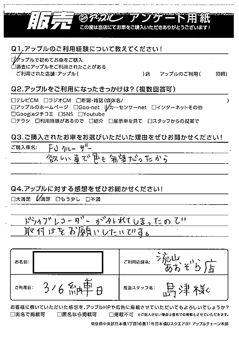 S様 車名:トヨタ FJクルーザー(国内モデル 右H)