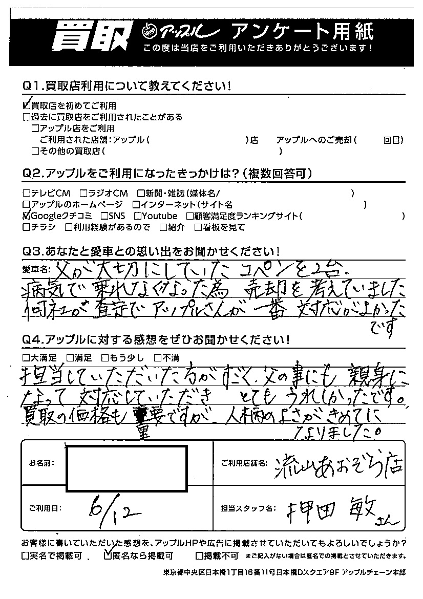 買取の価格も重要ですが、人柄のよさがきめてになりました。