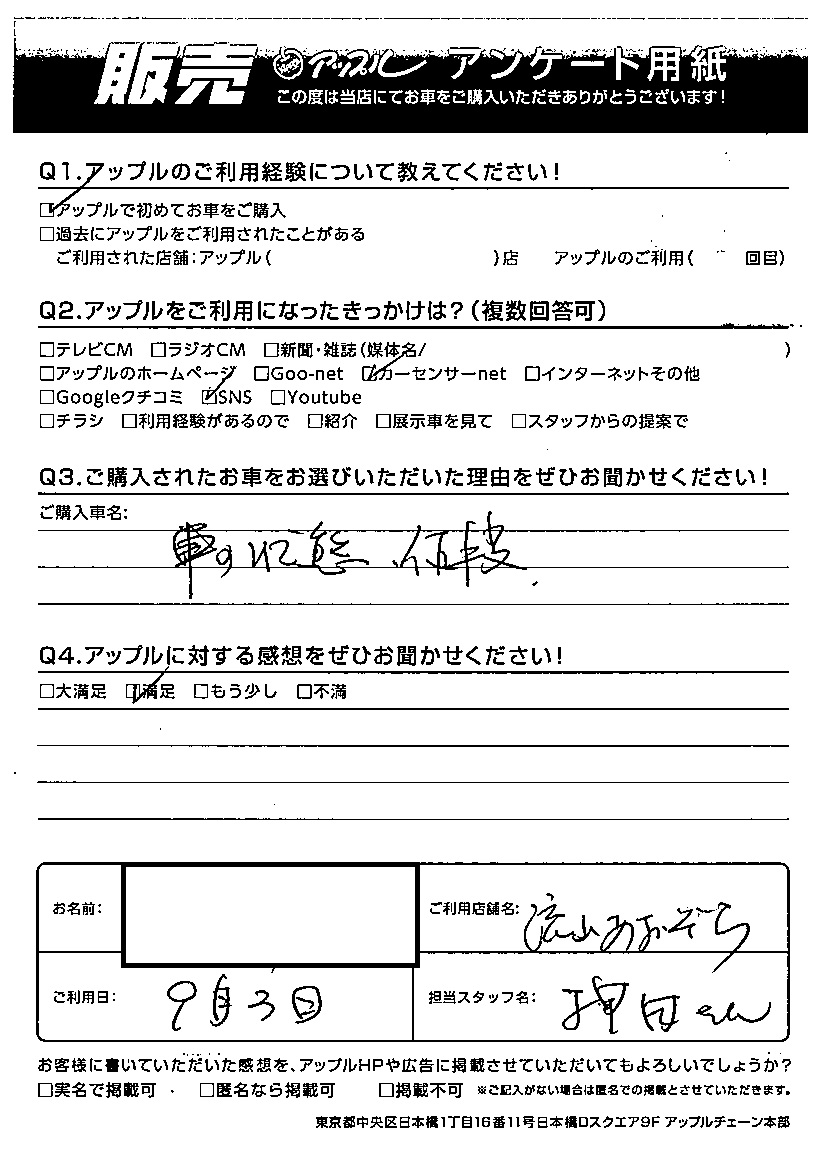 お車のご相談・ 査定だけでもOK! カンタン 入力 30秒 アップルがブランド買取始めました! お電話でも受付中! 受付時間10:00 ~ 18:30 0120-703-903 お車のご相談・ 査定だけでもOK! カンタン 入力 30秒 アップルがブランド買取始めました! お電話でも受付中! 受付時間10:00 ~ 18:30 0120-703-903 アップルがブランド買取始めました! お電話でも受付中! 受付時間10:00 ~ 18:30 0120-703-903 店舗情報 在庫車 スタッフ紹介 ブログ お客様の声 キャンペーン お得 無料査定 click お客様の声 ご記入日: 2022/08/30 S様 車名:ダイハツ コペン Qご購入されたお車をお選びいただいた理由をぜひお聞かせくださいコペン車の状態・値段Qアップルに対する感想をぜひお聞かせください!満足 前へ 次へ お客様の声一覧を見る