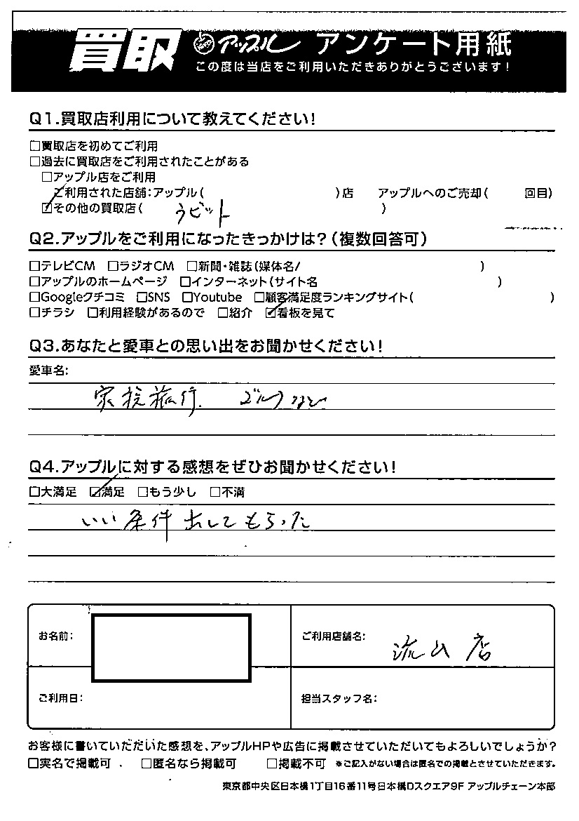 お車のご相談・ 査定だけでもOK! カンタン 入力 30秒 アップルがブランド買取始めました! お電話でも受付中! 受付時間10:00 ~ 18:30 0120-703-903 お車のご相談・ 査定だけでもOK! カンタン 入力 30秒 アップルがブランド買取始めました! お電話でも受付中! 受付時間10:00 ~ 18:30 0120-703-903 アップルがブランド買取始めました! お電話でも受付中! 受付時間10:00 ~ 18:30 0120-703-903 店舗情報 在庫車 スタッフ紹介 ブログ お客様の声 キャンペーン お得 無料査定 click お客様の声 ご記入日: 2022/10/15 O様 車名:トヨタ カローラフィールダー フィールダー(カローラ) Q.あなたと愛車の思い出をお聞かせください!家族旅行 ゴルフなどQアップルに対する感想をぜひお聞かせください!満足いい条件出してもらった 前へ 次へ お客様の声一覧を見る