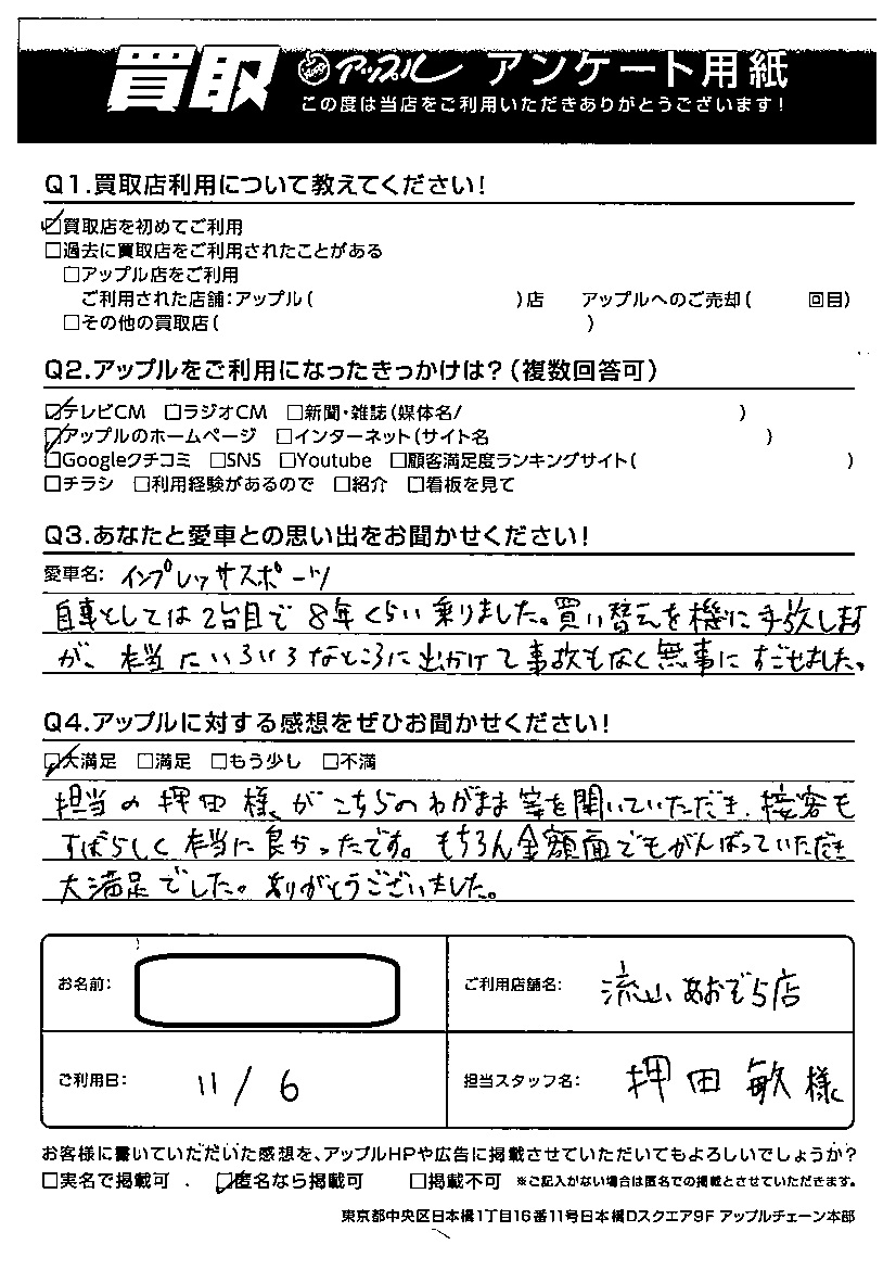 担当の押田様がこちらのわがままなどを聞いていただき、接客もすばらしく本当に良かったです。もちろん金額面でも頑張っていただき大満足でした。ありがとうございました。