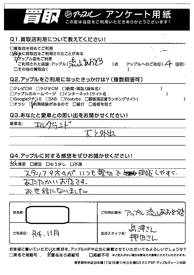初めての訪問にも丁寧に対応していただき引き取り価格は低かったのですが対応と人柄できめました!!次回も機会があれば又お願い。