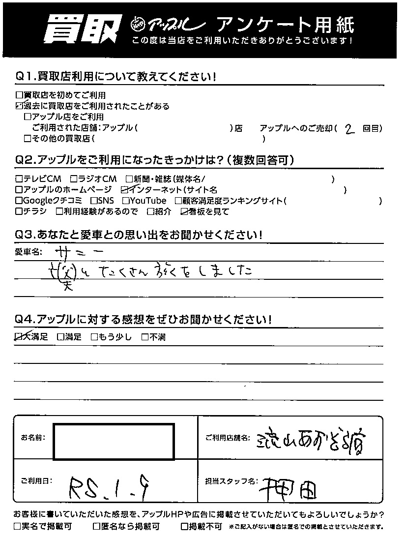 お車のご相談・ 査定だけでもOK! カンタン 入力 30秒 アップルがブランド買取始めました! お電話でも受付中! 受付時間10:00 ~ 18:30 0120-703-903 お車のご相談・ 査定だけでもOK! カンタン 入力 30秒 アップルがブランド買取始めました! お電話でも受付中! 受付時間10:00 ~ 18:30 0120-703-903 アップルがブランド買取始めました! お電話でも受付中! 受付時間10:00 ~ 18:30 0120-703-903 店舗情報 在庫車 スタッフ紹介 ブログ お客様の声 キャンペーン お得 無料査定 click お客様の声 ご記入日: 2023/01/09 M様 車名:日産 サニー(セダン) Q.あなたと愛車との思い出をお聞かせください!亡き夫(父)とたくさん旅をしましたQ.アップルに対する感想をぜひお聞かせください!大満足 前へ 次へ お客様の声一覧を見る