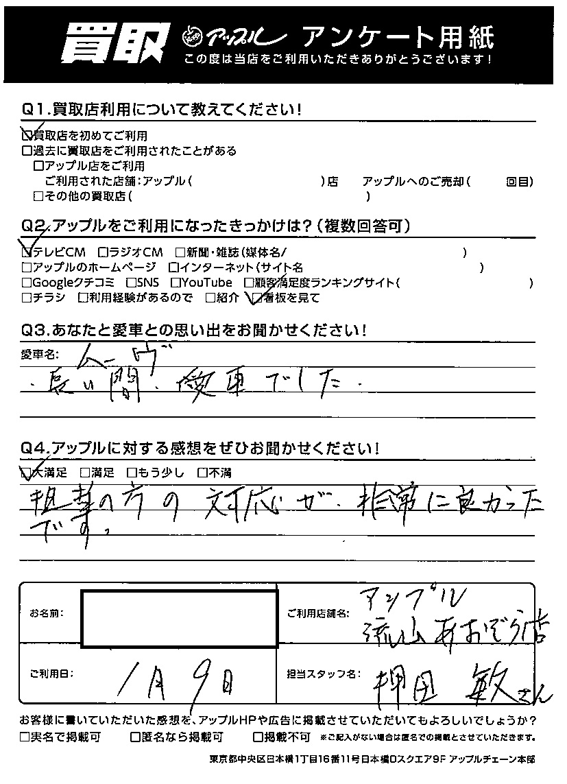 お車のご相談・ 査定だけでもOK! カンタン 入力 30秒 アップルがブランド買取始めました! お電話でも受付中! 受付時間10:00 ~ 18:30 0120-703-903 お車のご相談・ 査定だけでもOK! カンタン 入力 30秒 アップルがブランド買取始めました! お電話でも受付中! 受付時間10:00 ~ 18:30 0120-703-903 アップルがブランド買取始めました! お電話でも受付中! 受付時間10:00 ~ 18:30 0120-703-903 店舗情報 在庫車 スタッフ紹介 ブログ お客様の声 キャンペーン お得 無料査定 click お客様の声 ご記入日: 2023/01/09 N様 車名:ダイハツ ムーヴ Q.あなたと愛車との思い出をお聞かせください!長い間愛車でしたQ.アップルに対する感想をぜひお聞かせください!大満足担当の方の対応が非常に良かったです。 前へ 次へ お客様の声一覧を見る