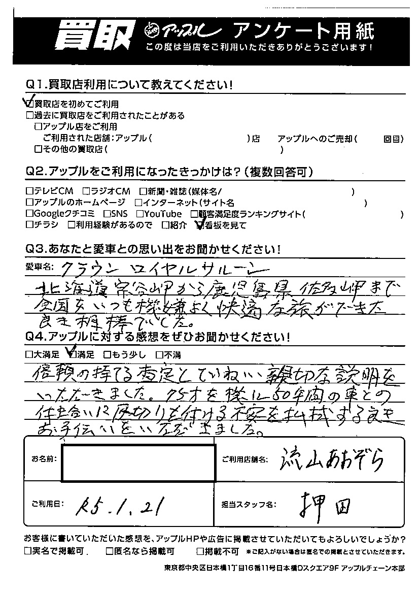 K様 車名:トヨタ クラウンロイヤル(H11年9月~H30年6月)