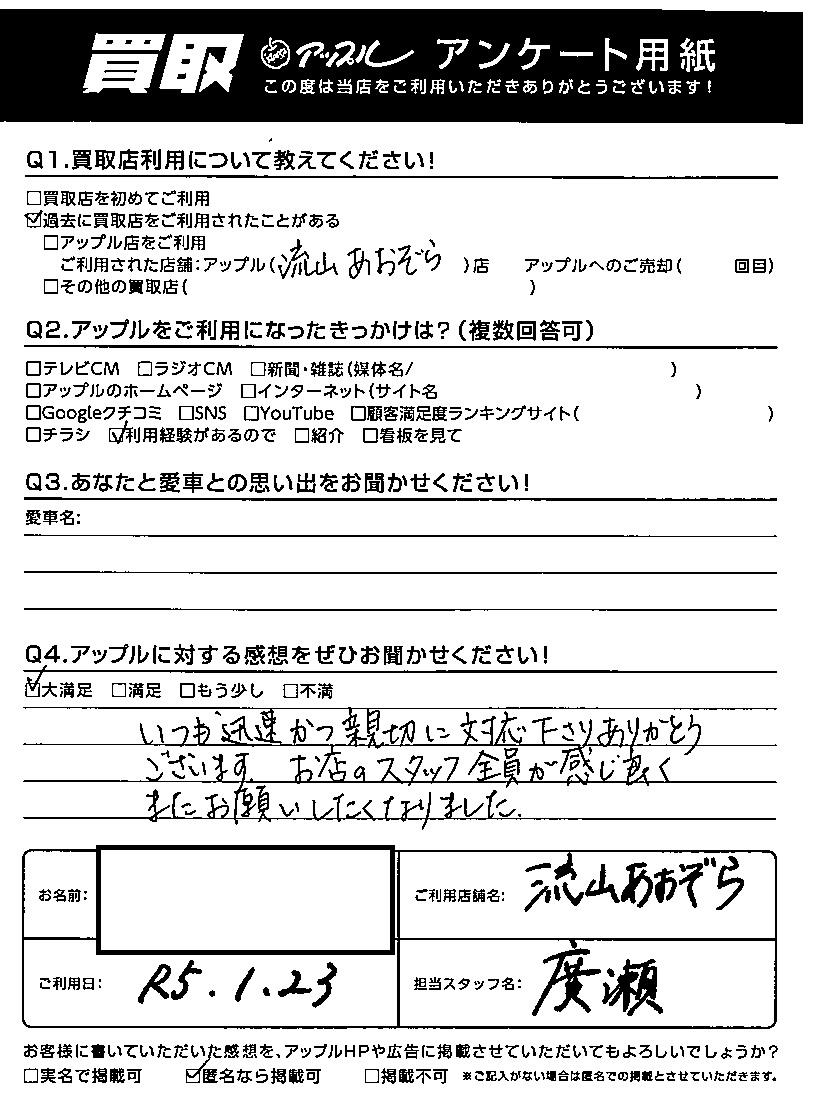 お車のご相談・ 査定だけでもOK! カンタン 入力 30秒 アップルがブランド買取始めました! お電話でも受付中! 受付時間10:00 ~ 18:30 0120-703-903 お車のご相談・ 査定だけでもOK! カンタン 入力 30秒 アップルがブランド買取始めました! お電話でも受付中! 受付時間10:00 ~ 18:30 0120-703-903 アップルがブランド買取始めました! お電話でも受付中! 受付時間10:00 ~ 18:30 0120-703-903 店舗情報 在庫車 スタッフ紹介 ブログ お客様の声 キャンペーン お得 無料査定 click お客様の声 ご記入日: 2023/01/23 K様 車名:トヨタ ハイエースバン Q.アップルに対する感想をぜひお聞かせください!大満足いつも迅速かつ親切に対応下さりありがとうございます。お店のスタッフ全員が感じ良くまたお願いしたくなりました。 前へ 次へ お客様の声一覧を見る