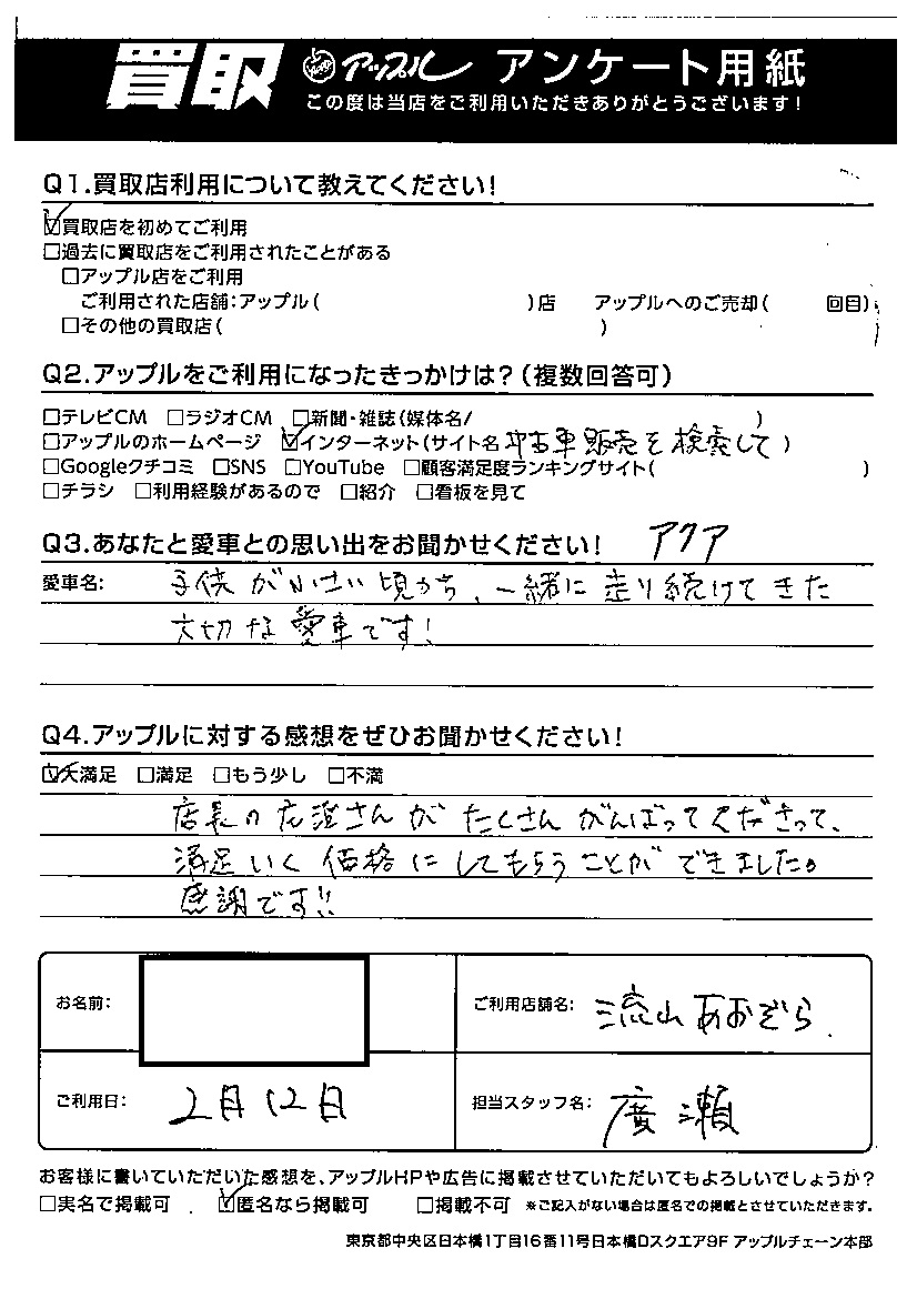 I様 車名:トヨタ アクア