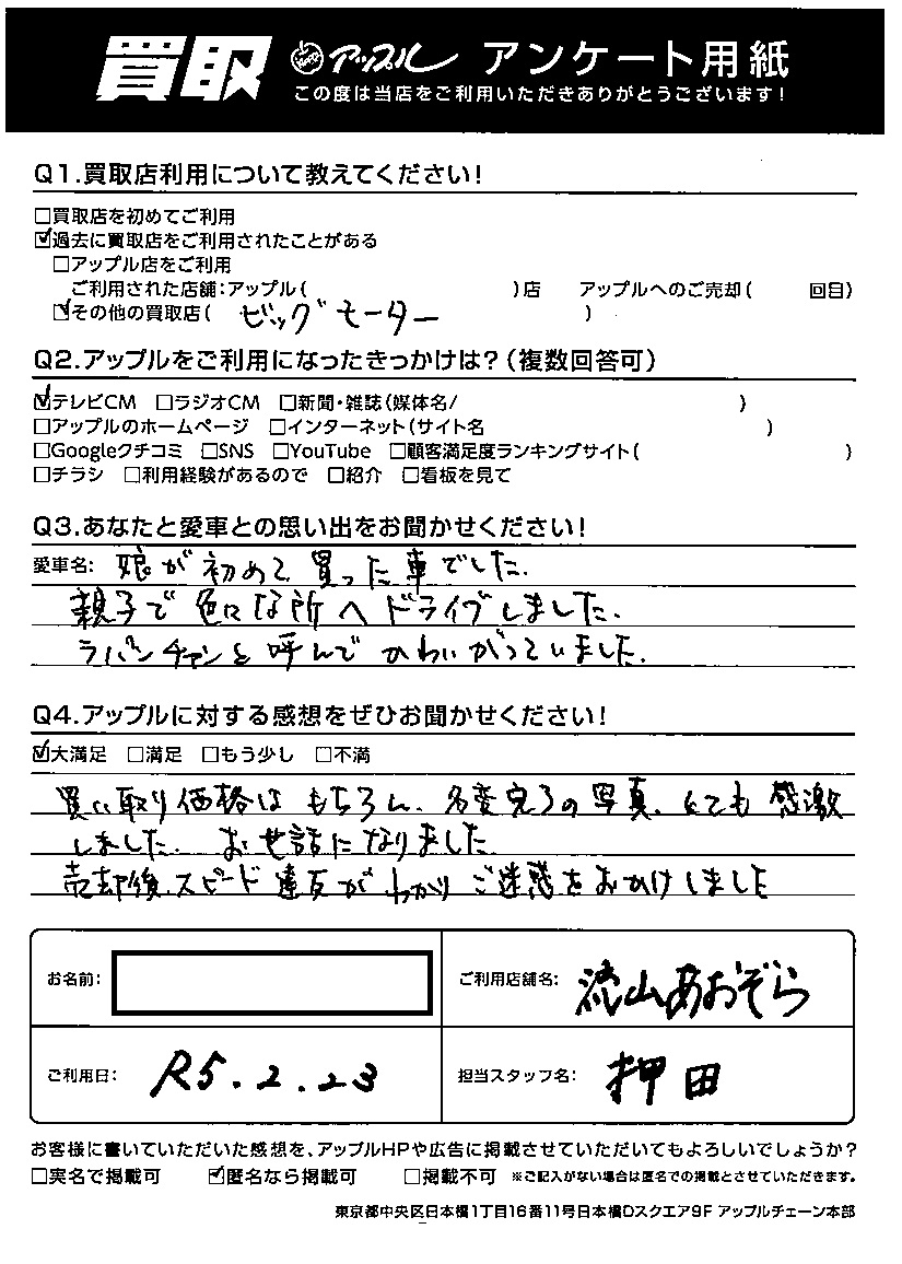 買取価格はもちろん、名変完了の写真、とても感激しました。お世話になりました。