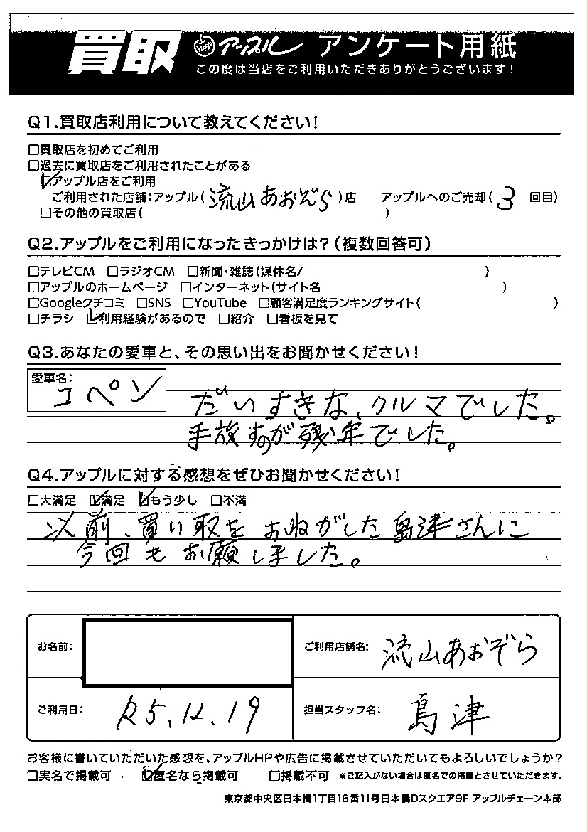 以前買い取をお願いした島津さんに今回もお願いしました。