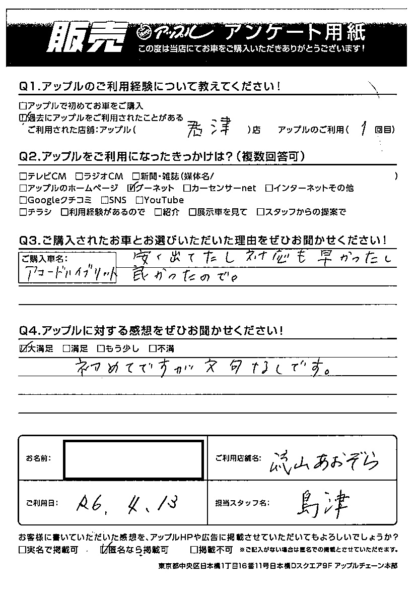 H様 車名:ホンダ アコードハイブリッド(~H28年5月)