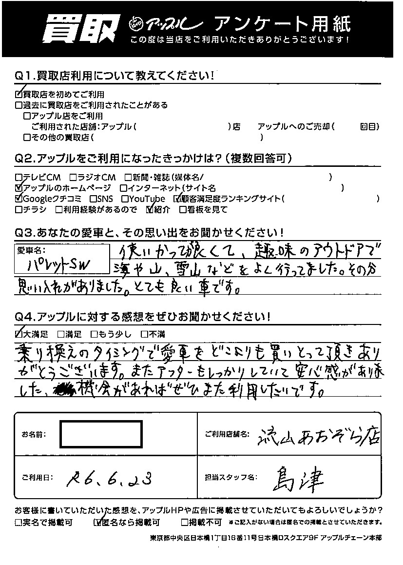 乗り換えのタイミングで愛車をどこよりも買いとって頂きありがとうございます。またアフターもしっかりしていて安心感がありました。機会があればぜひまた利用したいです。