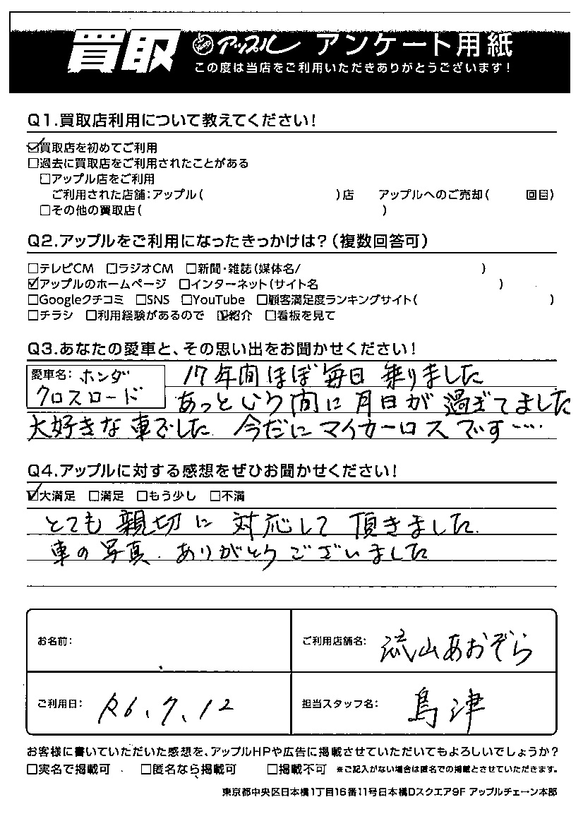 K様 車名:ホンダ クロスロード