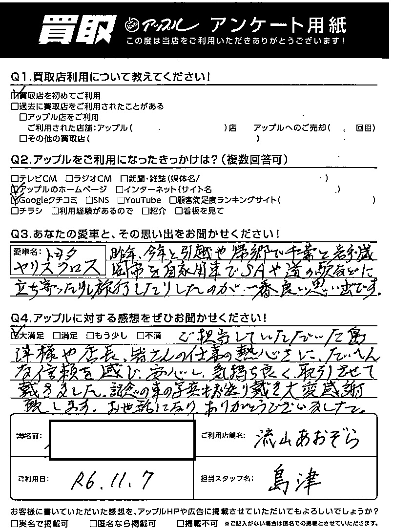 ご担当していただいた島津様や店長、皆さんの仕事の熱心さに大変な信頼を感じ、安心し、気持ち良く取引させていただきました。記念の車の写真もお送り戴き大変感謝致します。お世話になりありがとうございました。
