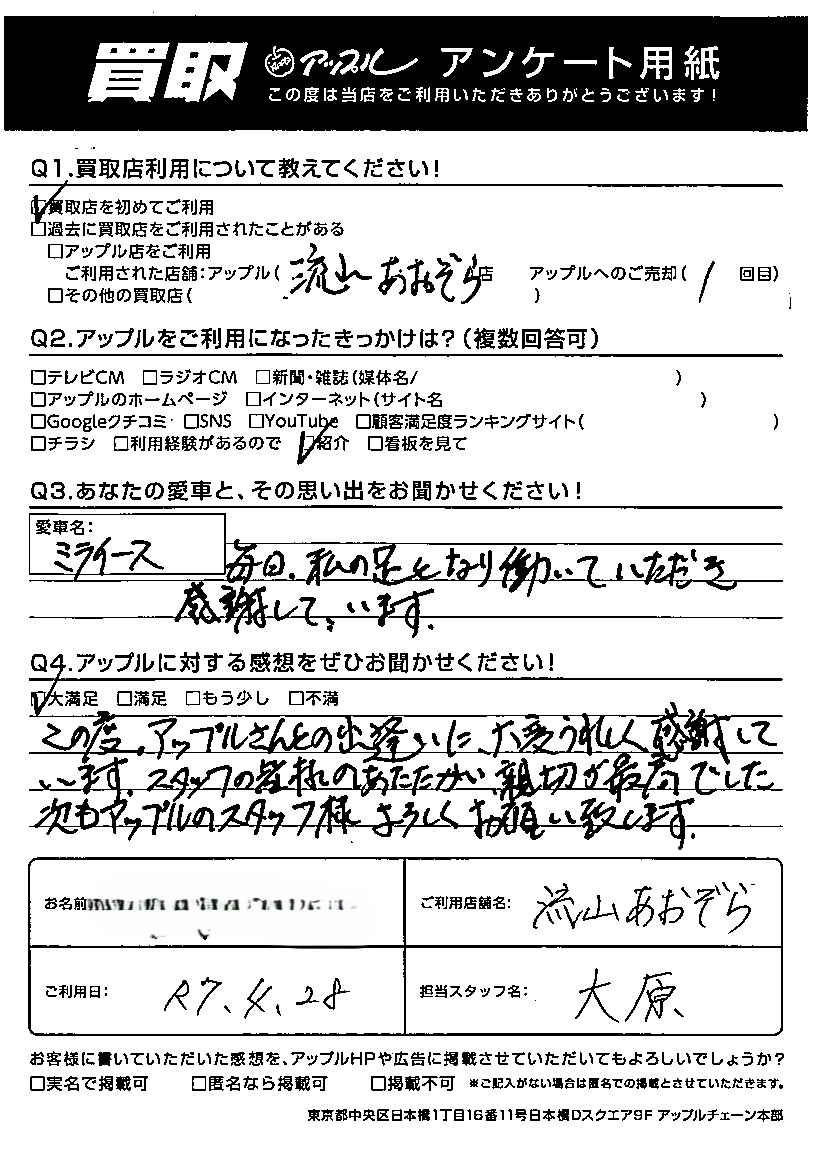 E様 車名:ダイハツ ミライース