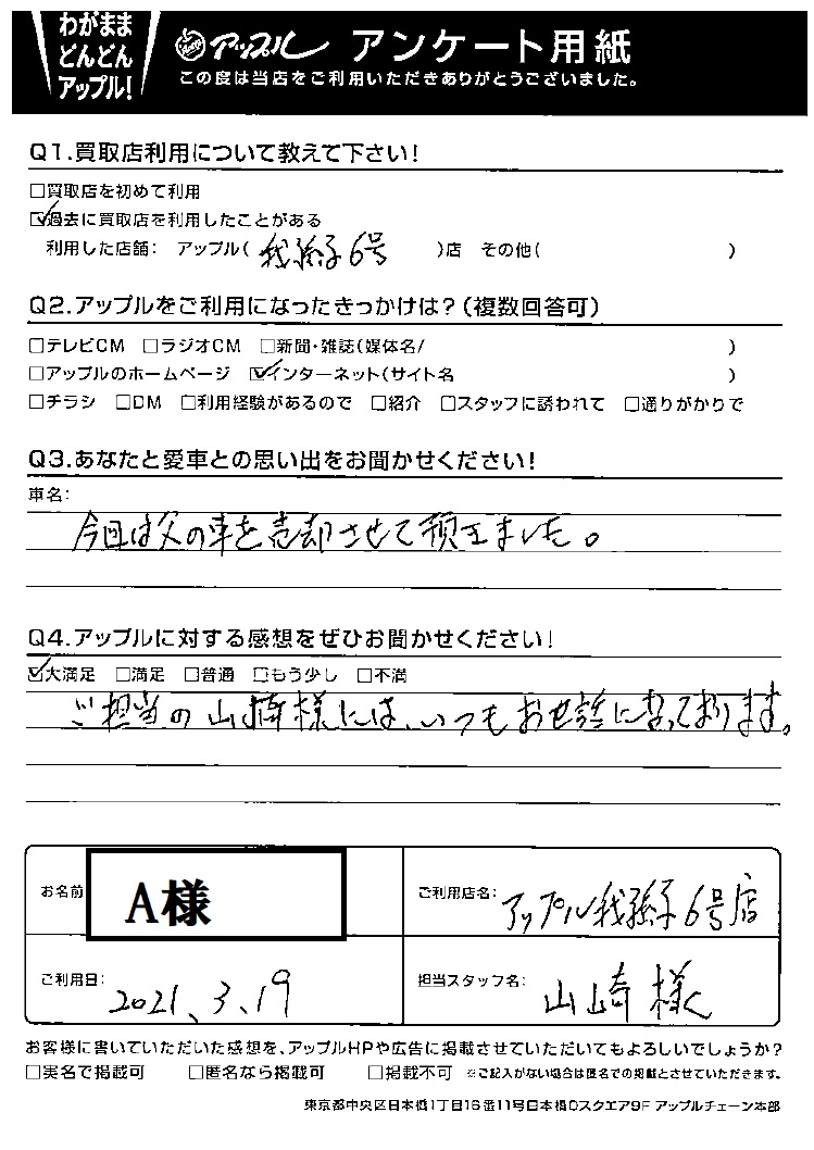 お車のご相談・ 査定だけでもOK! カンタン 入力 30秒 アップルがブランド買取始めました! お電話でも受付中! 受付時間10:00 ~ 19:00 04-7182-5411 お車のご相談・ 査定だけでもOK! カンタン 入力 30秒 アップルがブランド買取始めました! お電話でも受付中! 受付時間10:00 ~ 19:00 04-7182-5411 アップルがブランド買取始めました! お電話でも受付中! 受付時間10:00 ~ 19:00 04-7182-5411 店舗情報 在庫車 スタッフ紹介 ブログ お客様の声 キャンペーン 無料査定 click お客様の声 ご記入日: 2021/03/19 A様 Q:あなたと愛車との思い出をお聞かせください!今回は父の車を売却させて頂きました。Q:アップルに対する感想をぜひお聞かせください!大満足ご担当の山崎様には、いつもお世話になっております。 前へ 次へ お客様の声一覧を見る