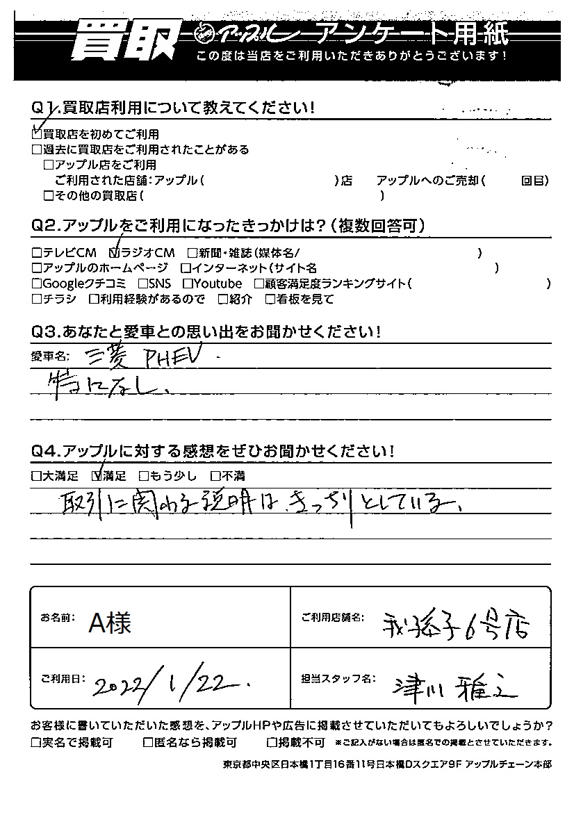 お車のご相談・ 査定だけでもOK! カンタン 入力 30秒 アップルがブランド買取始めました! お電話でも受付中! 受付時間10:00 ~ 19:00 04-7182-5411 お車のご相談・ 査定だけでもOK! カンタン 入力 30秒 アップルがブランド買取始めました! お電話でも受付中! 受付時間10:00 ~ 19:00 04-7182-5411 アップルがブランド買取始めました! お電話でも受付中! 受付時間10:00 ~ 19:00 04-7182-5411 店舗情報 在庫車 スタッフ紹介 ブログ お客様の声 キャンペーン 無料査定 click お客様の声 ご記入日: 2022/01/22 A様 車名:三菱 アウトランダーPHEV Q アップルに対する感想をぜひお聞かせください!感想:満足取引に関わる説明はきっちりとしている。 前へ 次へ お客様の声一覧を見る