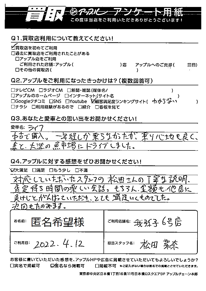 対応していただいたスタッフの松田さんの丁寧な説明、査定待ち時間の楽しい会話。