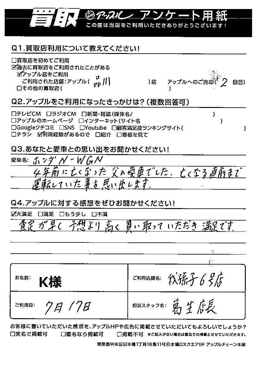 K様 車名:ホンダ N-WGN