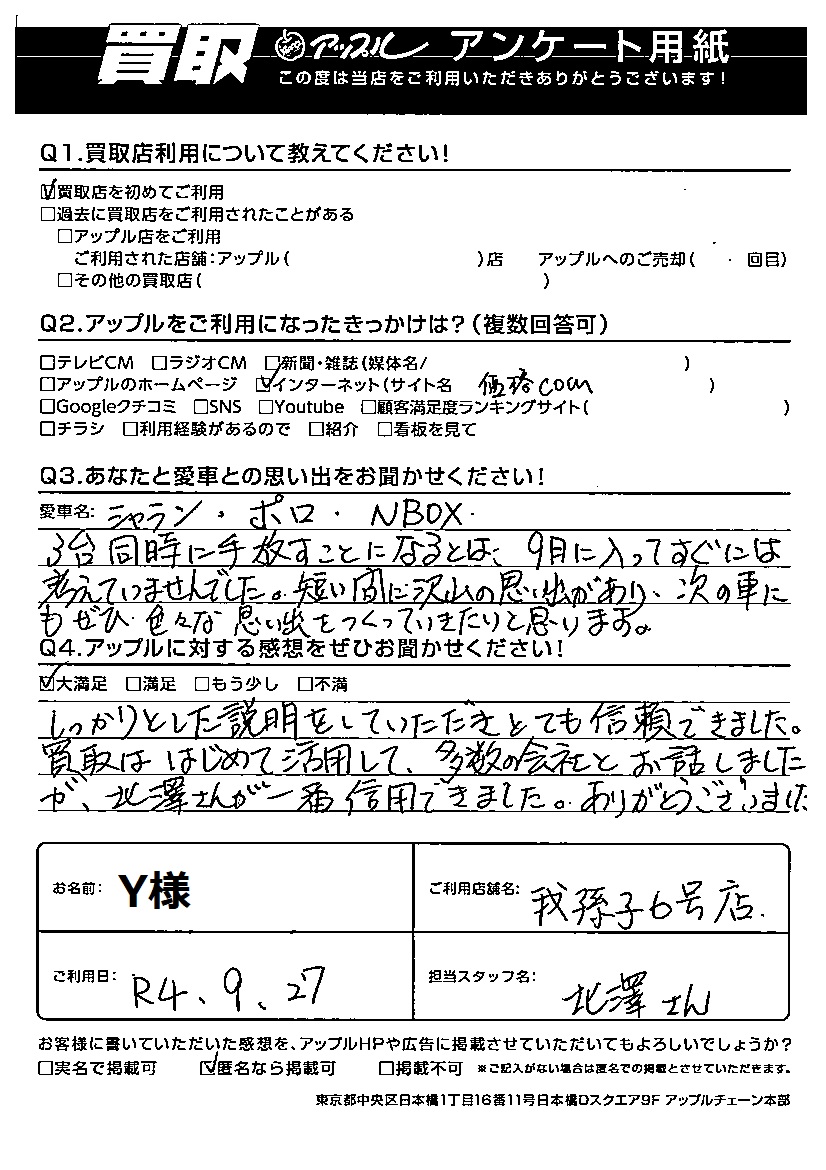 しっかりとした説明をしていただきとても信頼できました。買取ははじめて活用して、多数の会社とお話しましたが、北澤さんが一番信用できました。ありがとうございました。