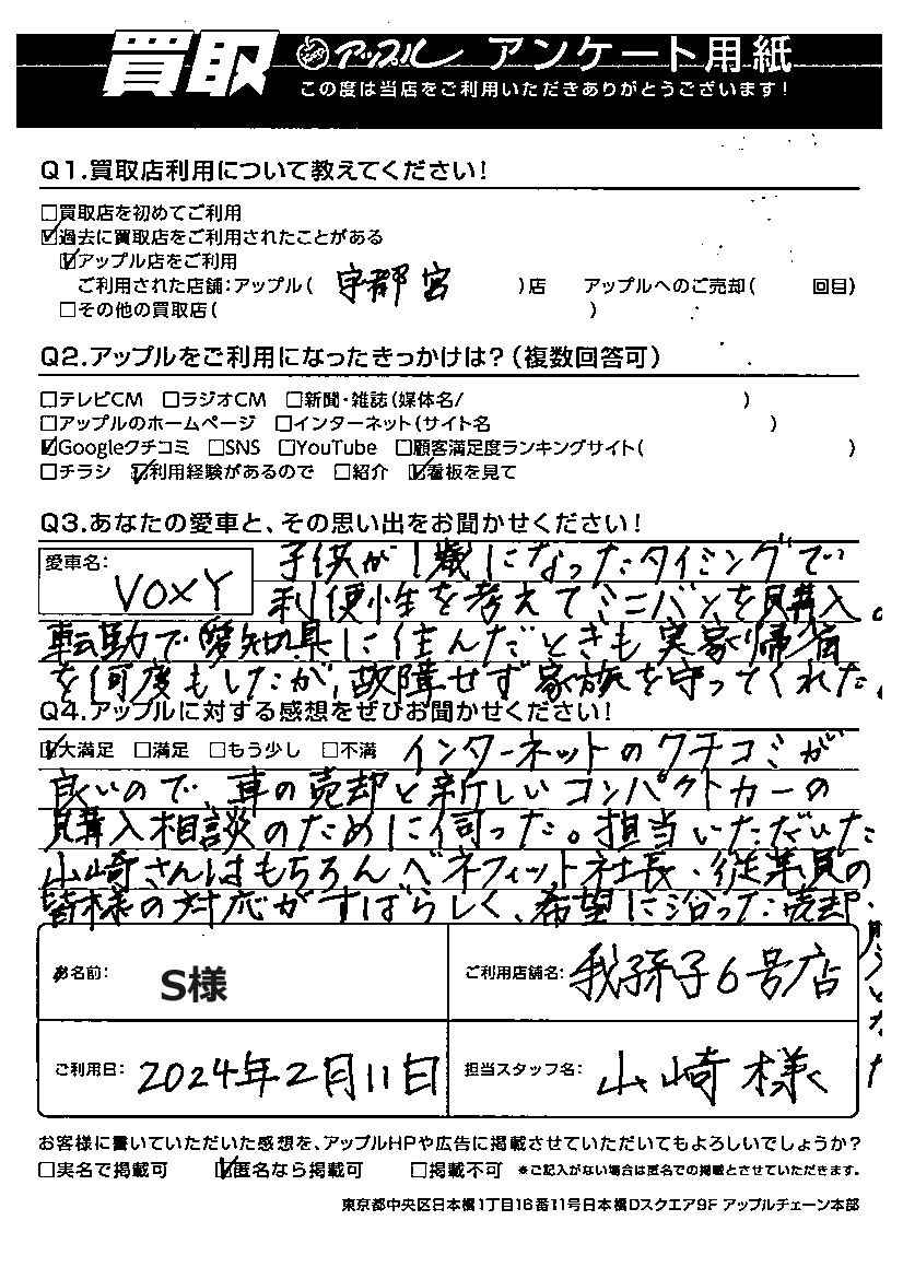 インターネットのクチコミが良いので、車の売却と新しいコンパクトカーの購入相談のために伺った。担当いただいた山崎さんはもちろんベネフィット社長、従業員の皆様の対応がすばらしく、希望に沿った売却・購入となった。