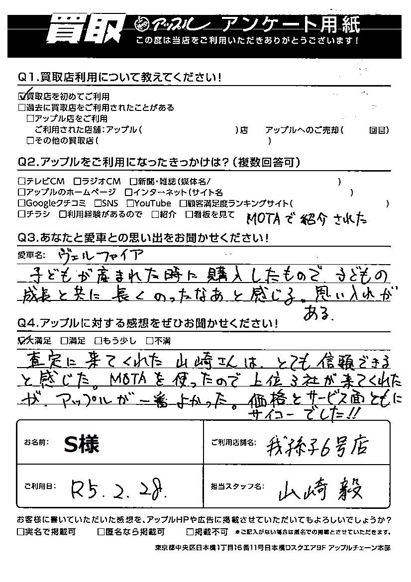査定に来てくれた山崎さんはとても信頼できると感じた。MOTAを使ったので上位3社が来てくれたがアップルが一番よかった。価格とサービス面ともにサイコーでした!!