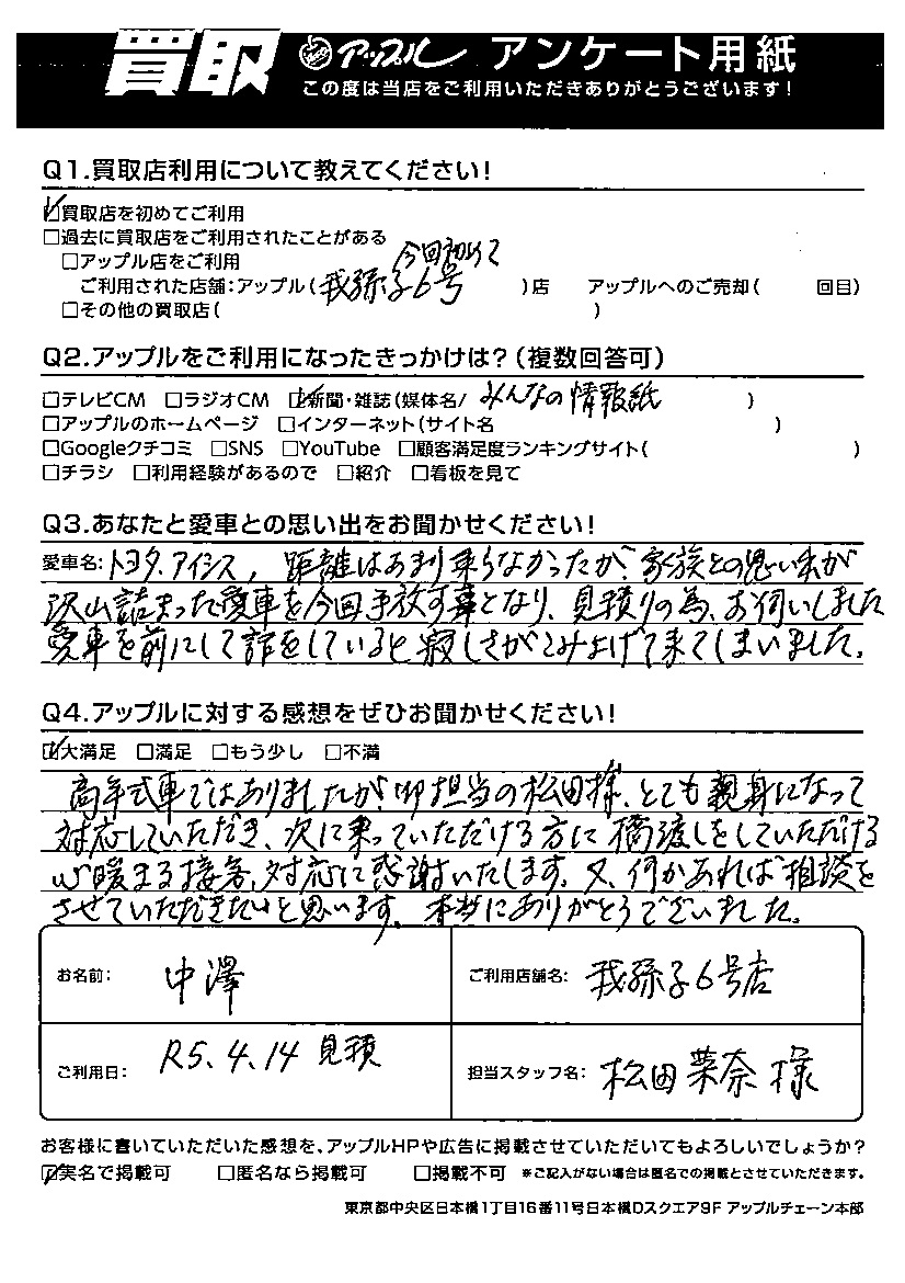 高年式車ではありましたが、御担当の松田様、とても親身になって対応していただき、次に乗っていただける方に橋渡しをしていただける心暖まる接客、対応に感謝いたします。又、何かあれば相談をさせていただきたいと思います。本当にありがとうございました。