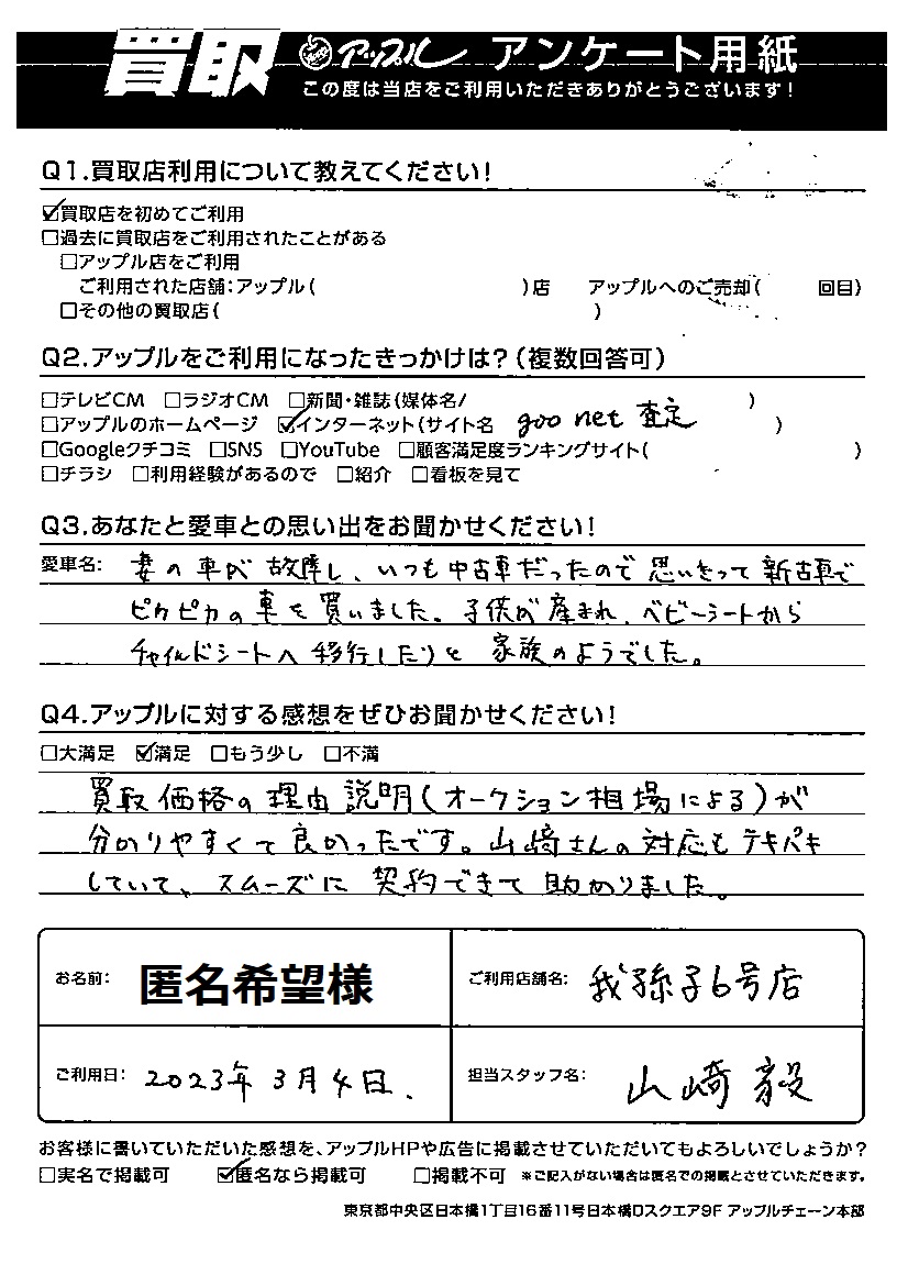 買取価格の理由説明(オークション相場による)が分かりやすくて良かったです。山崎さんの対応もテキパキしていて、スムーズに契約できて助かりました。